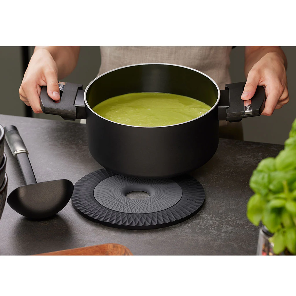 El set de 2 salvamanteles CIRCO de Gefu es la solución inteligente y versátil para proteger tus superficies de cocina de ollas, cazos y sartenes calientes de diferentes tamaños. Fabricados con silicona de alta calidad, estos salvamanteles cuentan con una estructura especial en forma de panal de abeja que los hace aislantes y antideslizantes.