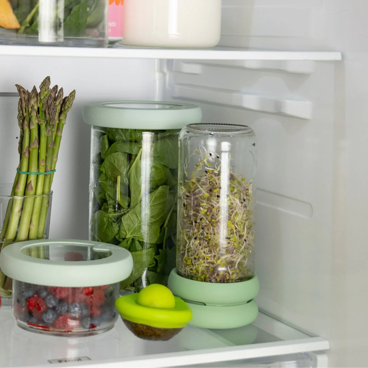 El set incluye dos tapas de distinto tamaño, que además encajan entre ellas, ocupando el mínimo espacio cuando no las utilizas. Al ser de diferente medida, son aptas para conservar aguacates de todas las medidas. Fabricadas con silicona 100% platino, libres de BPA, plomo y ftalatos, las tapas son una opción segura y sostenible para mantener tus aguacates frescos por más tiempo sin tener que recurrir a plásticos de un solo uso y reduciendo el desperdicio alimentario.