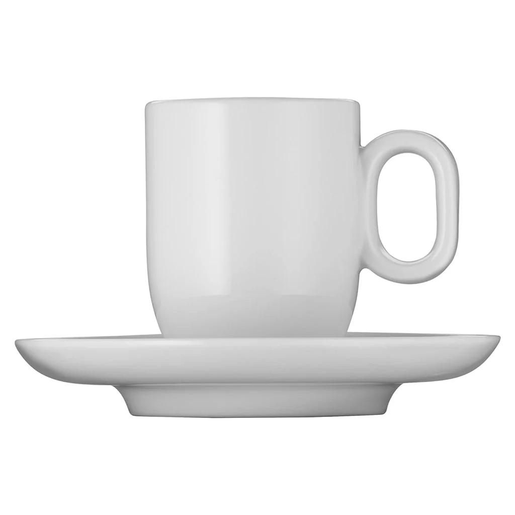 - Pack de 2 tazas con platillos para espresso (60 ml): Perfecto para quienes disfrutan del café más intenso y concentrado. La capacidad de 60 ml y su diseño compacto permiten conservar el calor ideal y destacar el cuerpo y los aromas del espresso. Además, su forma y grosor optimizan la experiencia, asegurando un sorbo perfecto.