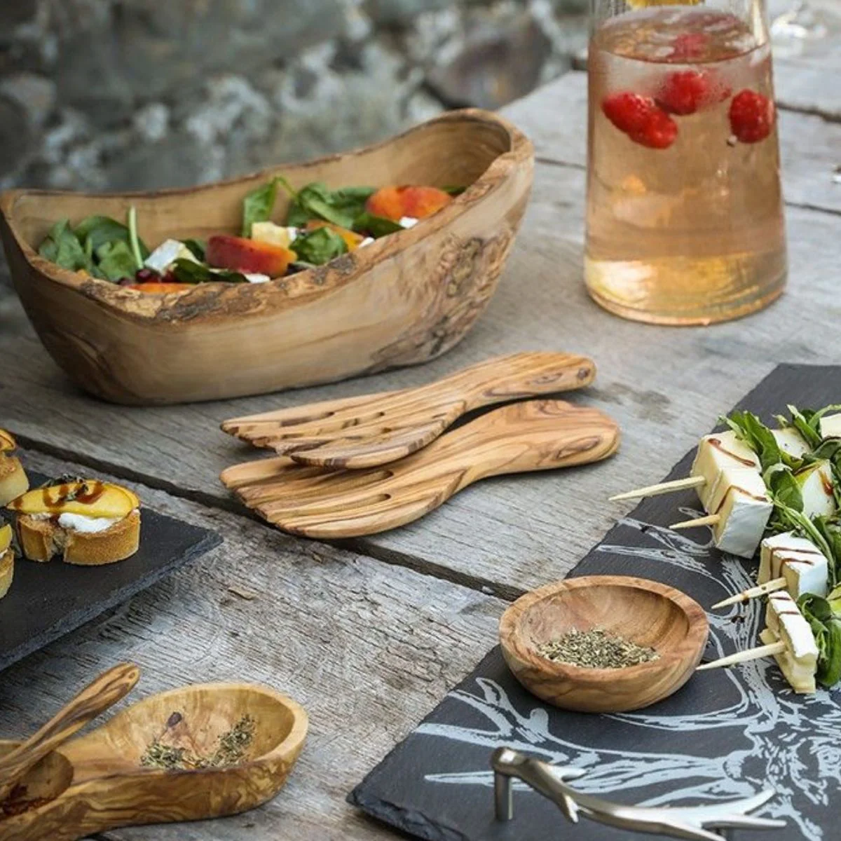 - Cada set es único por su fabricación artesanal y por la diferente veta de la madera de olivo, que le confiere un toque rústico y muy elegante.