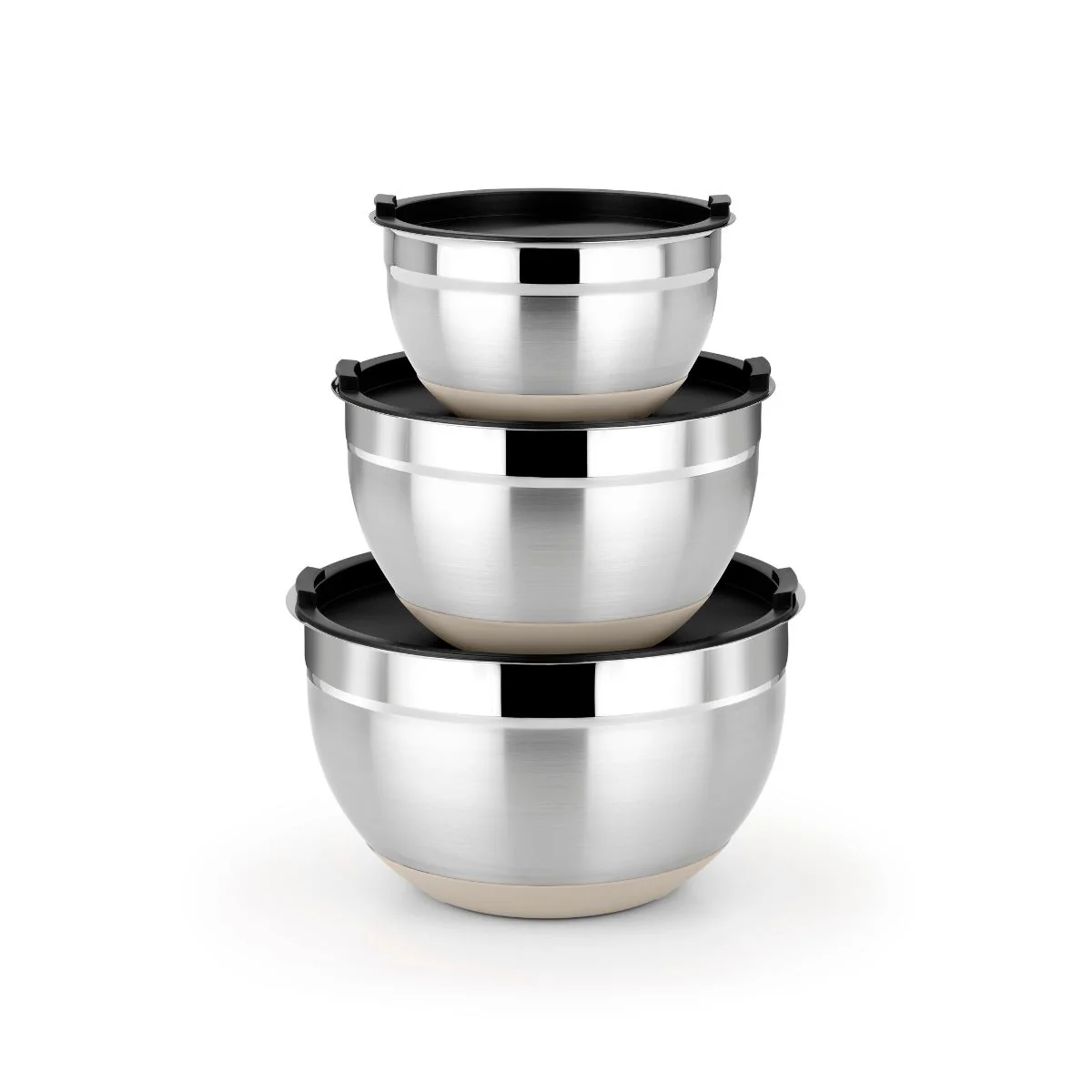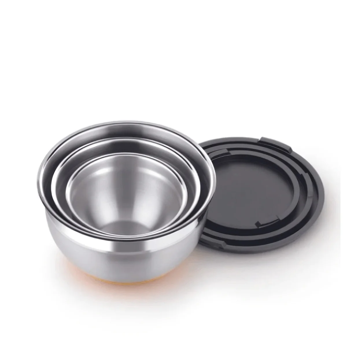 Los boles disponen de base de silicona antideslizante, que evita que se muevan mientras mezclas, aportándoles estabilidad y seguridad. Al ser de acero inoxidable no absorben olores ni sabores. Son higiénicos y perfectos para batir, mezclar y preparar masas, y también para llevar a la mesa las ensaladas, el arroz de acompañamiento, unos aperitivos o las palomitas recién hechas. Y si sobra algo, ¡la tapa se ocupará de mantener el contenido en perfecto estado!