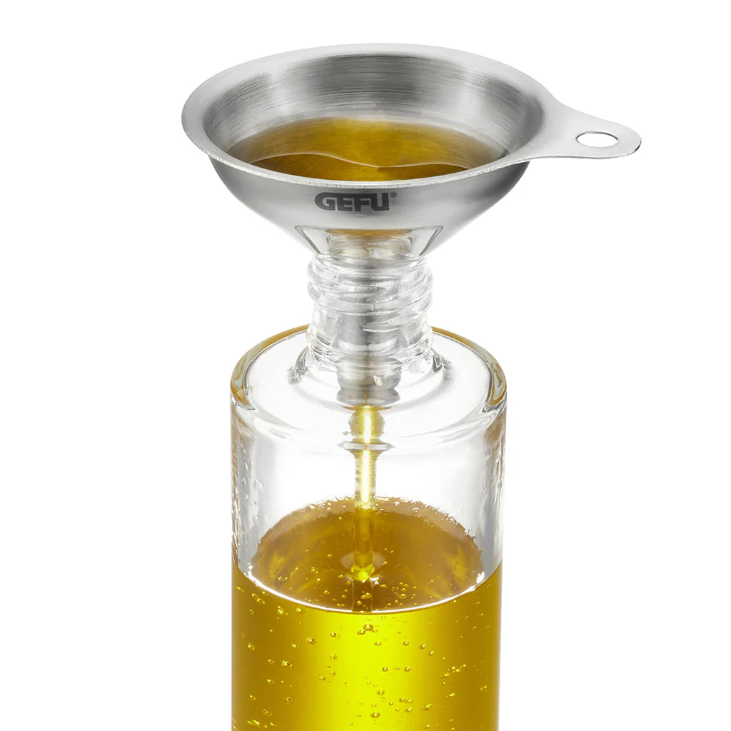 Si hay algo que no puede faltar en la cocina es un embudo. Y con el Set de 3 embudos acero inox VERSARE de Gefu tendrás tres medidas diferentes para que puedas llenar limpiamente botellas, termos, aceiteras, molinillos de especias o botes de salsas, sea cual sea su tamaño. Los 3 embudos del conjunto son encajables entre ellos, ocupando el mínimo espacio, y su anilla metálica de sujeción los mantiene unidos cuando no los estés utilizando.