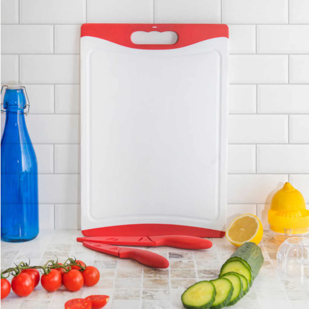 todo piezas esenciales para preparar tus recetas y con los que podrás picar, pelar, rebanar o cortar con precisión y facilidad incluso los tomates. En referencia a la tabla de cortar, cuenta con almohadillas de silicona antideslizantes para mantener la seguridad durante el corte, siendo a la vez reversible para ayudar a prevenir la contaminación cruzada.