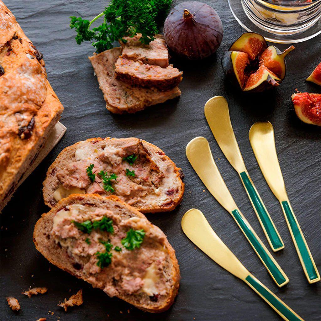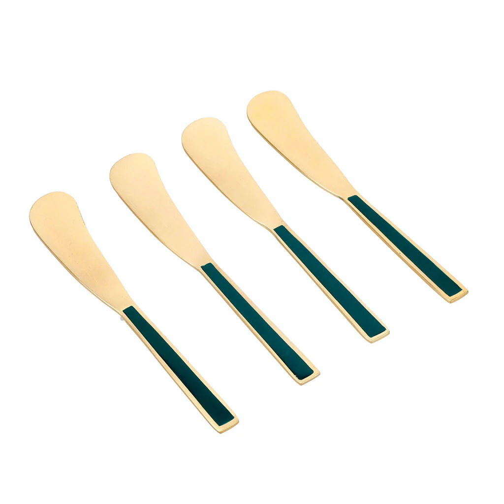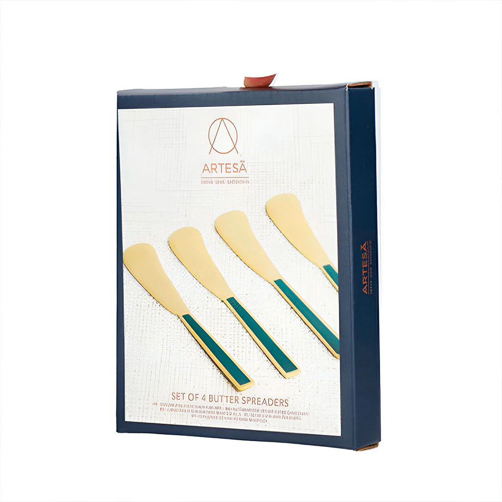 El set de cuchillos dorados para untar de Artesà es un detalle exquisito para presentar tus aperitivos con un toque sofisticado, o servir la mesa de desayuno como todos querrían empezar el día. Cada cuchillo está fabricado en acero inoxidable chapado en oro y cuenta con un elegante mango de esmalte verde esmeralda que aporta un contraste único. Estos untadores son ideales para servir mantequilla, patés o mermeladas en momentos especiales, convirtiendo cada pequeño bocado en una experiencia memorable.