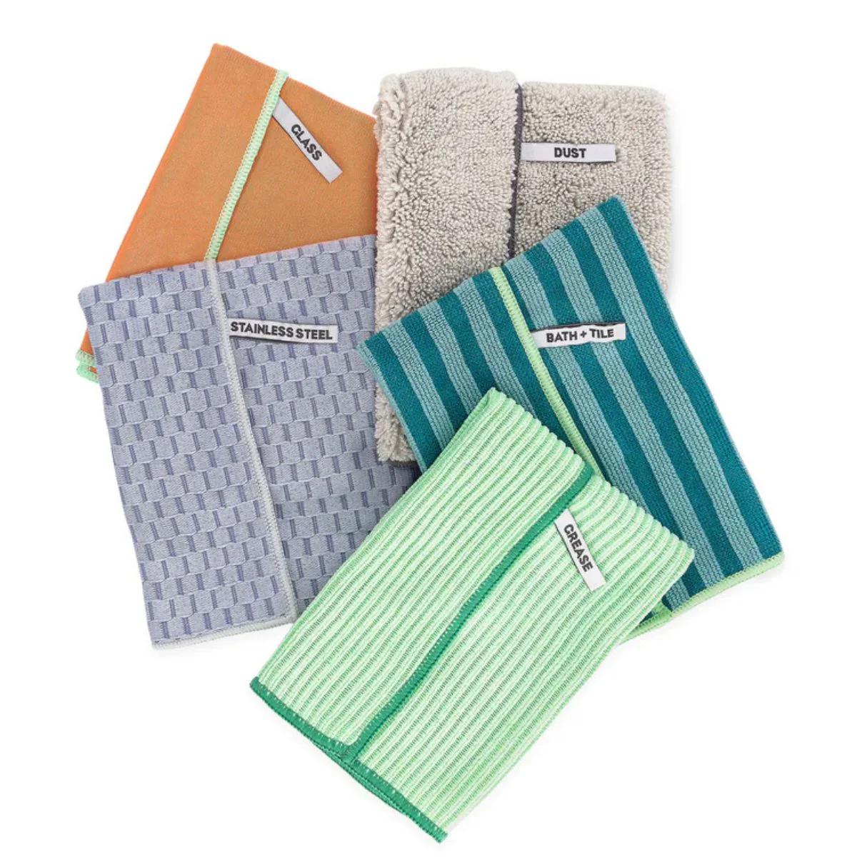 El set de 5 paños de microfibra Renew de Full Circle incluye un paño para cada tipo de superficie. El primero está fabricado específicamente para la limpieza del baño y los azulejos (etiquetado con BATH AND TILES), el segundo para limpiar y atrapar el polvo (DUST), el tercero para el vidrio (etiquetado con GLASS), el cuarto para la grasa que se acumula en la cocina, hornos o estufas (GREASE) y el quinto para piezas de acero inoxidable (STAINLESS STEEL). ¡Si es que no puede ser más completo!
