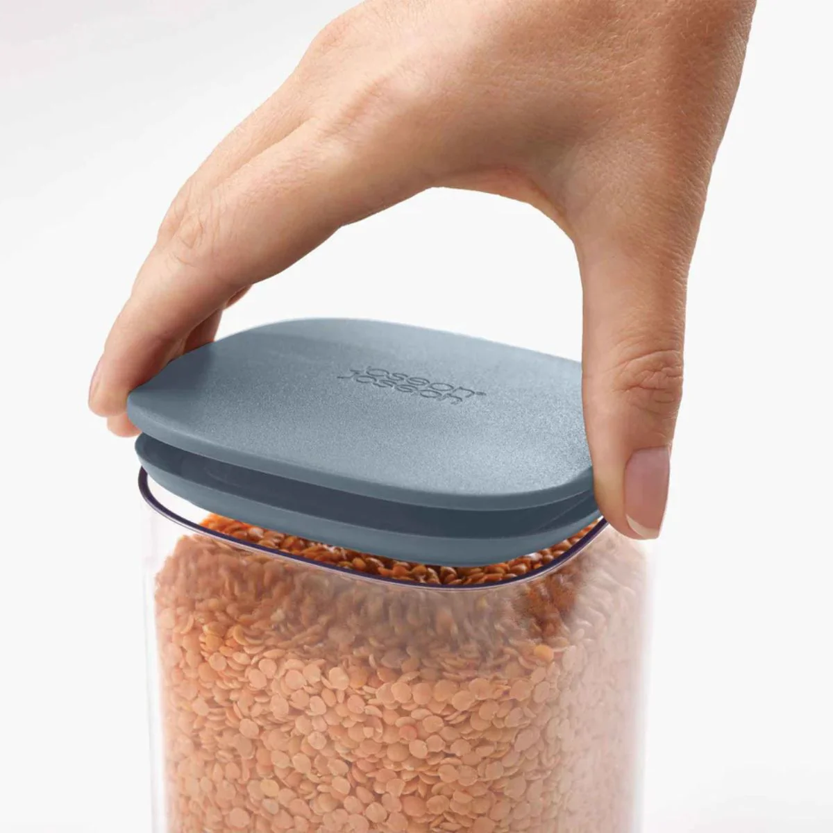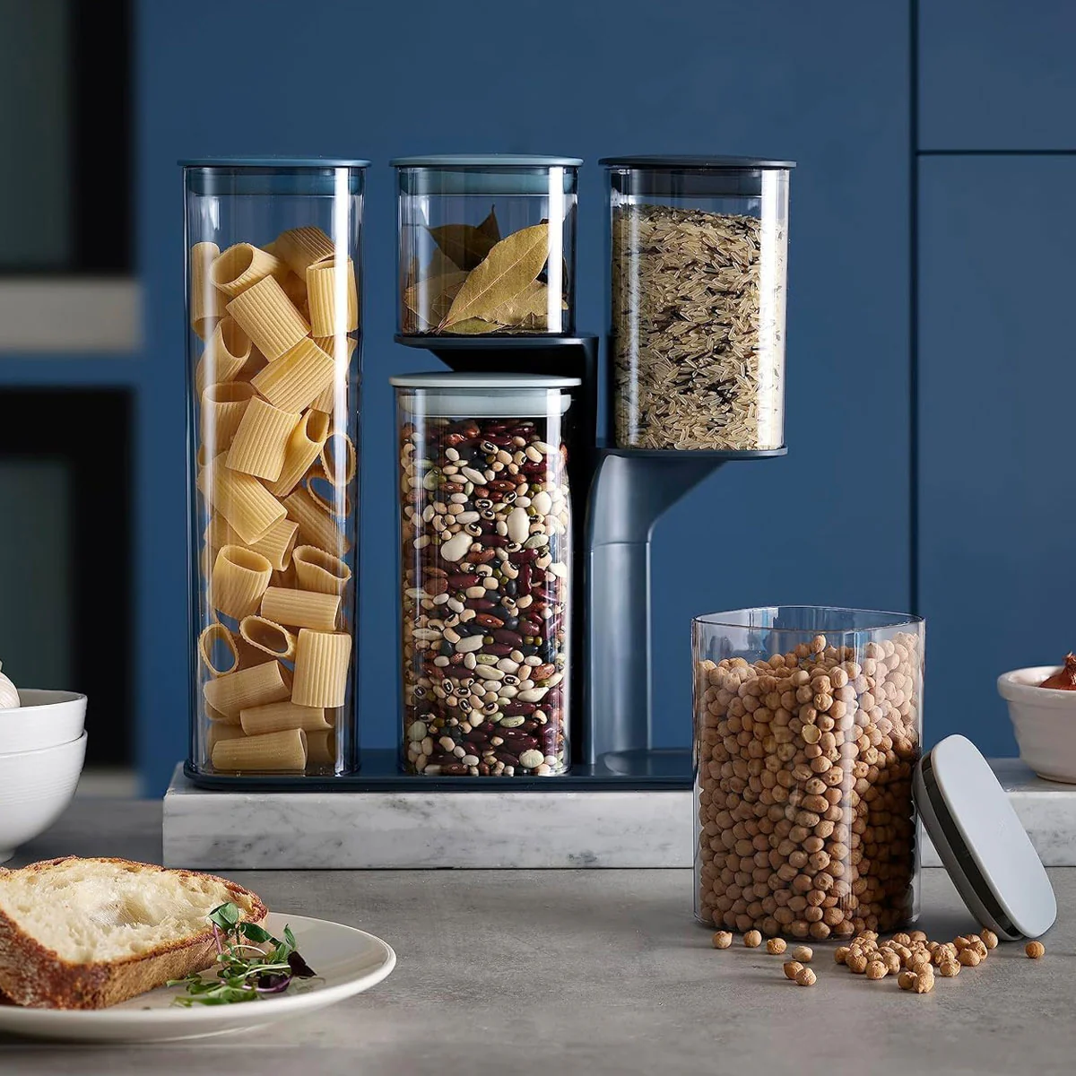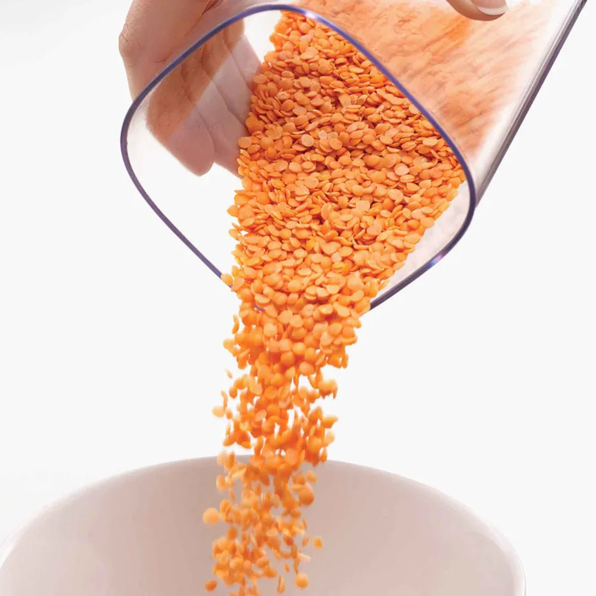 Cada tarro cuenta con tapa hermética con junta de silicona, ideal para conservar alimentos secos como pasta, arroz, harina, legumbres o frutos secos manteniendo todo fresco durante más tiempo. Sus esquinas redondeadas facilitan el vertido sin derrames y su diseño transparente te permite ver fácilmente el contenido y la cantidad restante.