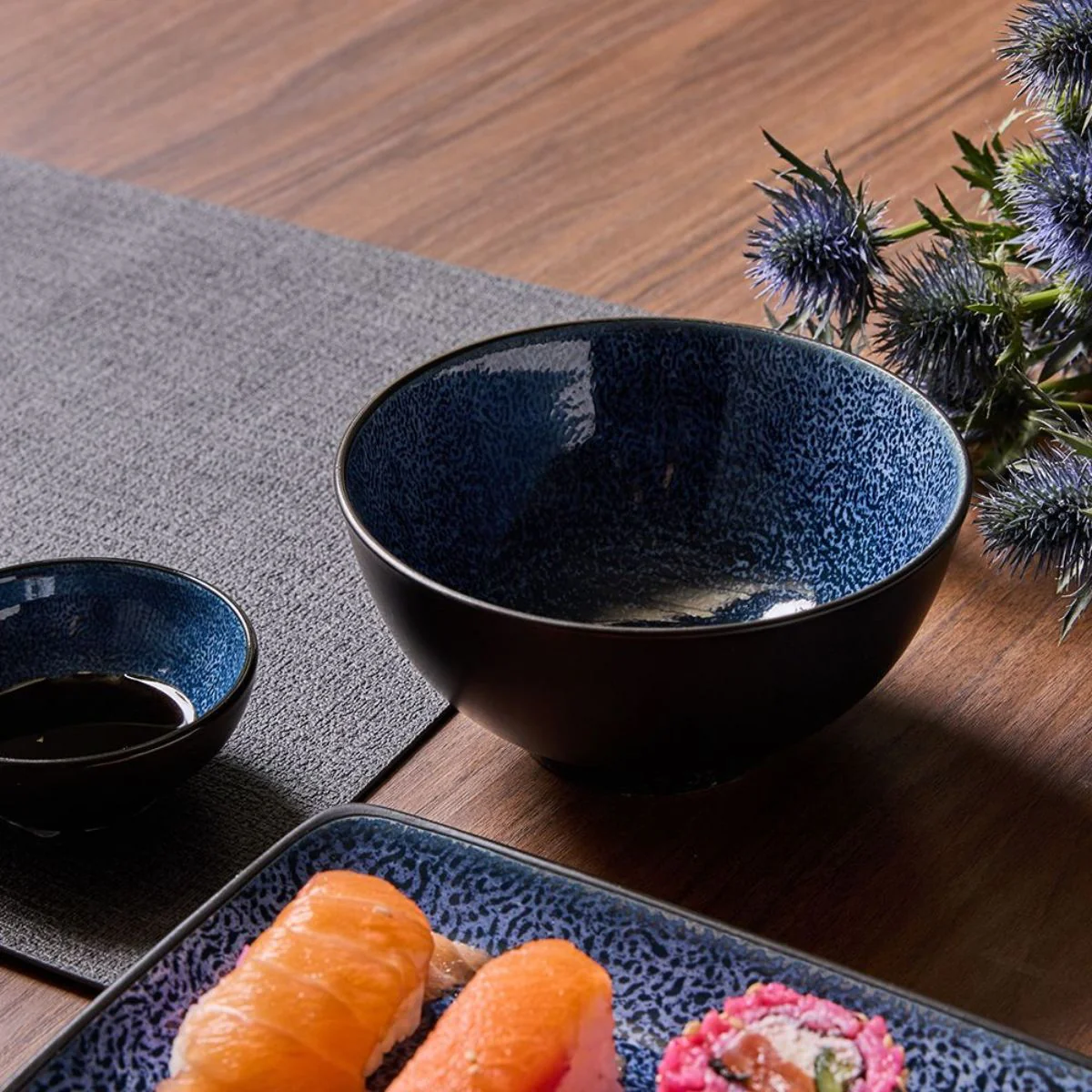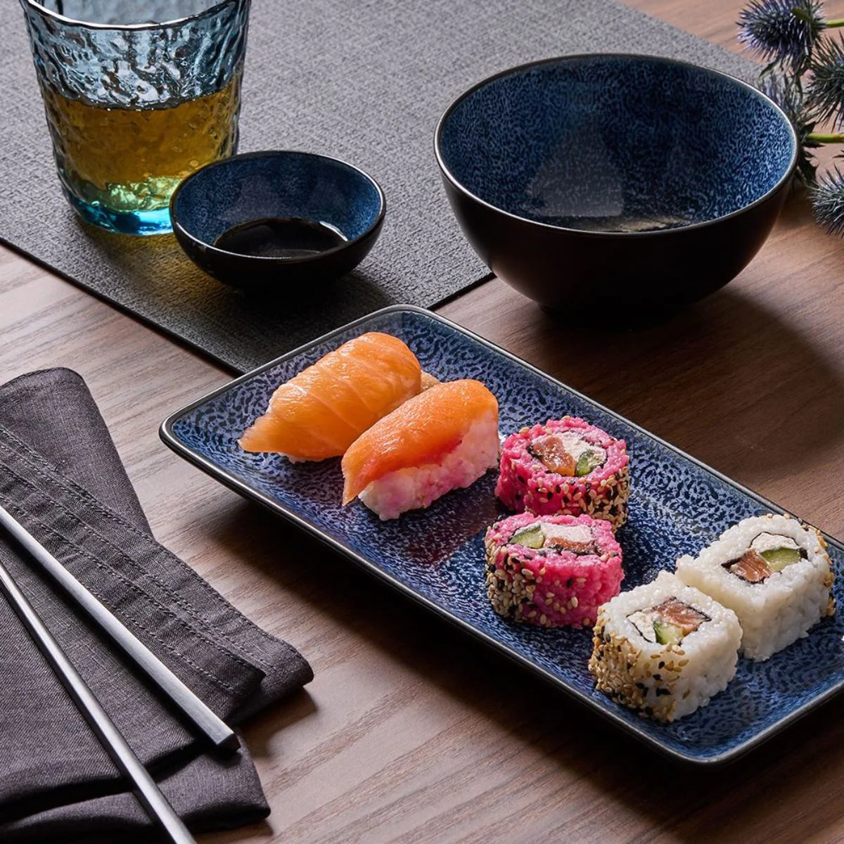 Este set de 8 piezas de porcelana para sushi Tognana aportará un toque elegante con aires orientales a tu mesa. Los platos y los boles para arroz cuentan son de color azul oscuro mate y su interior es negro brillante. En cambio, los boles para la salsa son de un color un poco más clarito.