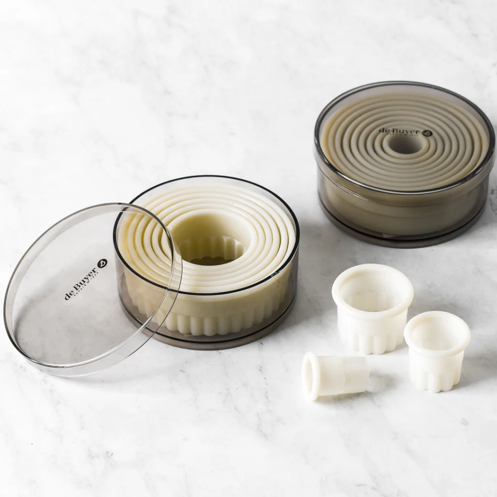 La Caja de 9 cortadores redondos De Buyer va a convertirse en un imprescindible en tu cocina. Estos cortadores redondos acanalados te permiten cortar del tamaño que prefieras no solo galletas, sino también masas como la de pizza, la brisa, el hojaldre o bases de tartas para que puedas hacer tus elaboraciones, adaptándolas a la medida que elijas.
