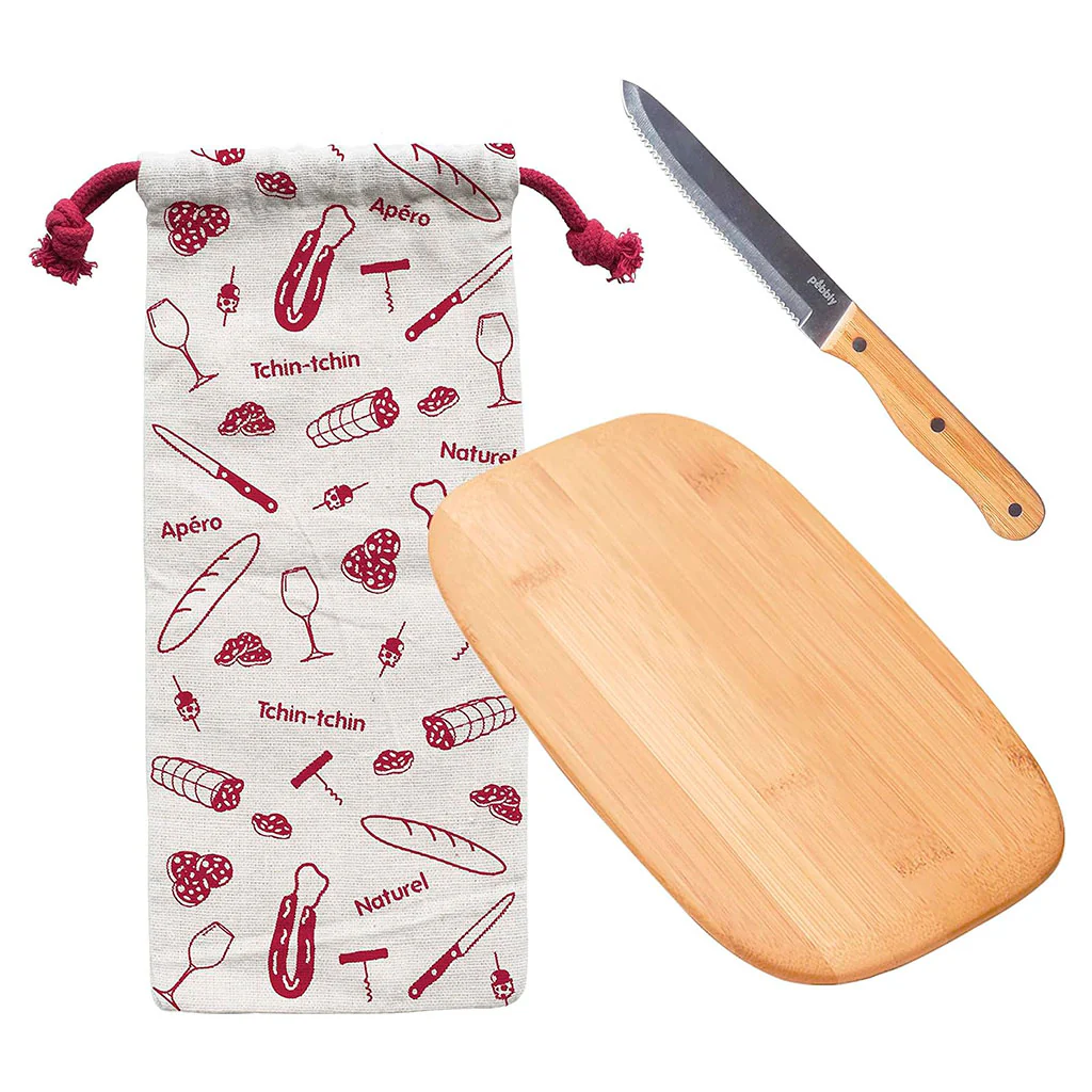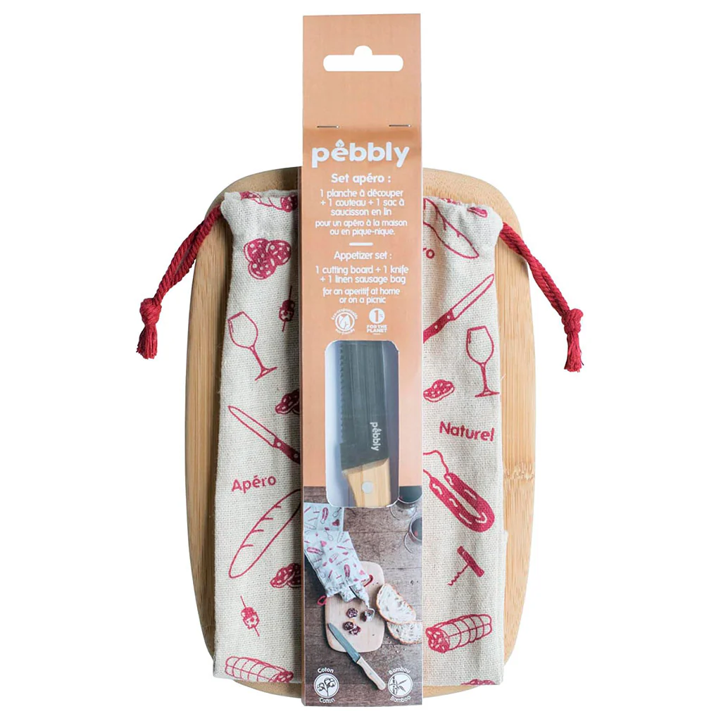 El Set de aperitivo Pebbly es el conjunto ideal para tus aperitivos. Este juego incluye una resistente tabla de cortar de bambú, un cuchillo a juego y una práctica y preciosa bolsa de almacenamiento para que puedas tener todo organizado.
