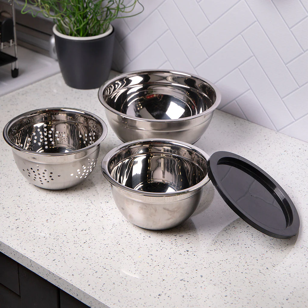 El Set de boles y colador inox Masterclass de KitchenCraft es un conjunto de tres piezas de acero inoxidable, imprescindibles en la cocina. Formado por un bol grande ideal para mezclar, un colador perfecto para lavar y escurrir frutas, verduras e incluso pasta y un cuenco pequeño con tapa, en el que conservar los alimentos frescos por más tiempo.