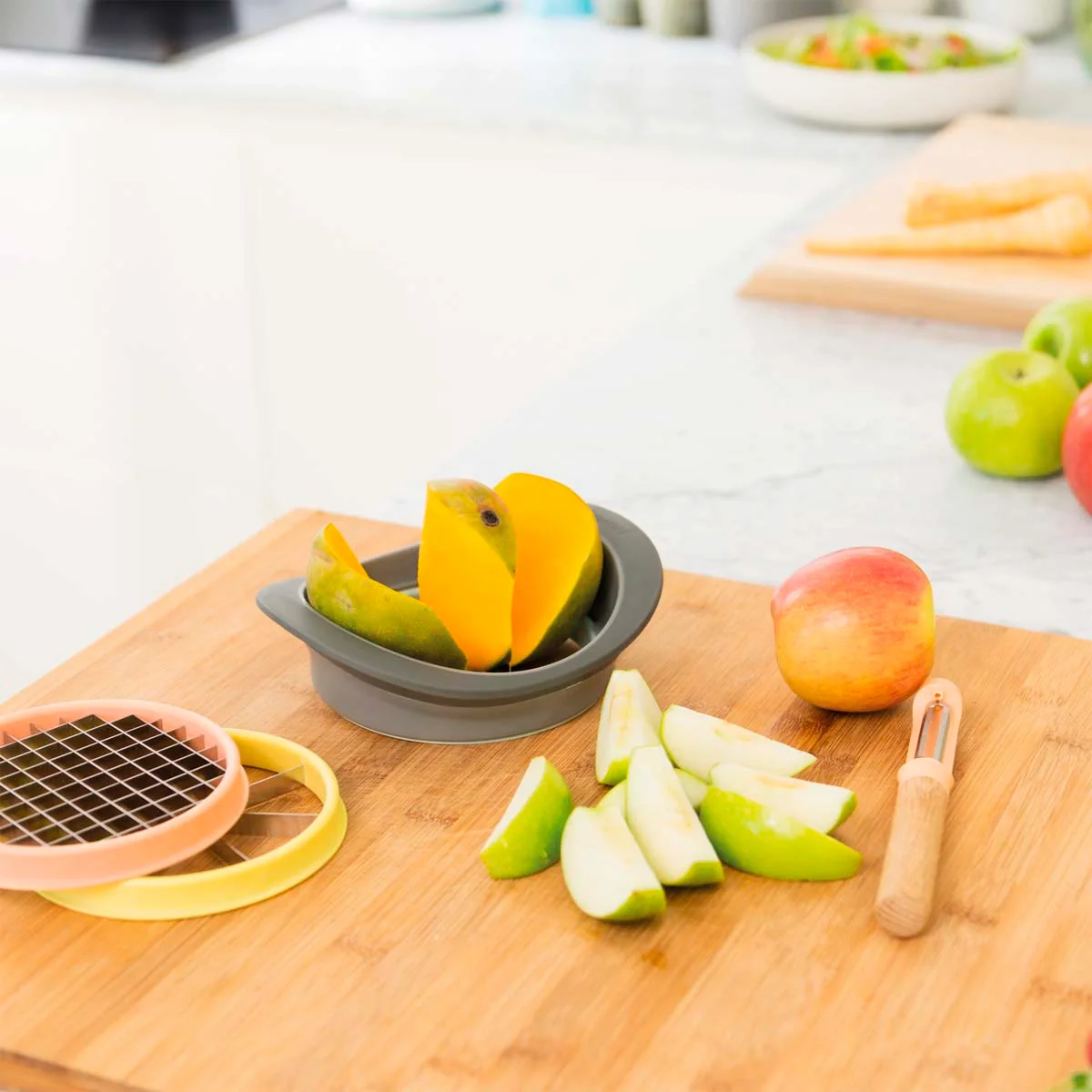 Bastará con una simple presión para descorazonar esta manzana que necesitas para preparar un pastel. Sin esfuerzo podrás hacer dados de este mango para preparar un postre o podrás cortar las patatas para acompañar un plato combinado. El set de cortador de frutas y verduras será de las cosas que más utilices a diario en tu cocina.
