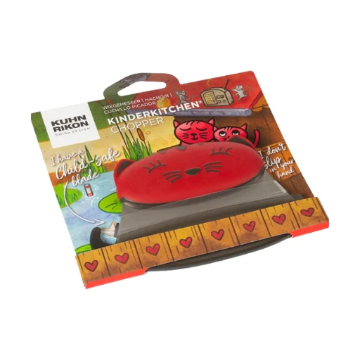 El cuchillo mezzaluna tiene la cara de un gato en el mango de color rojo. Viene acompañado de una funda con las patitas y la cola del felino. Este tipo de cuchillos, con hoja curvada y forma de media luna, es perfecto para que aprendan a cortar de forma segura.