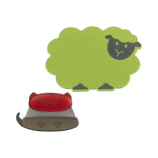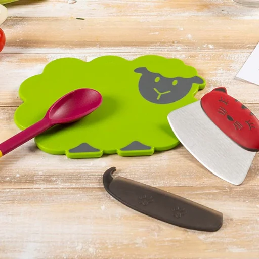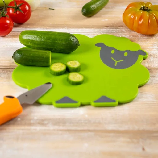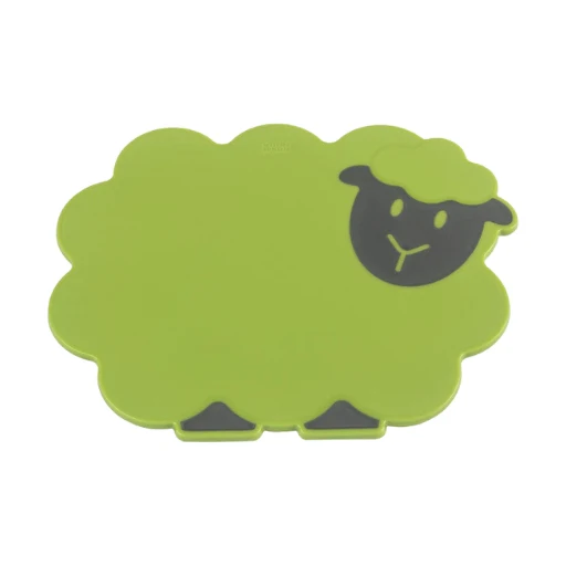 - La tabla de corte es de color verde y tiene la silueta de una oveja. Cuenta con pies antideslizantes que la hacen más segura y permiten que se mantenga en su sitio mientras cortan los alimentos en ella.