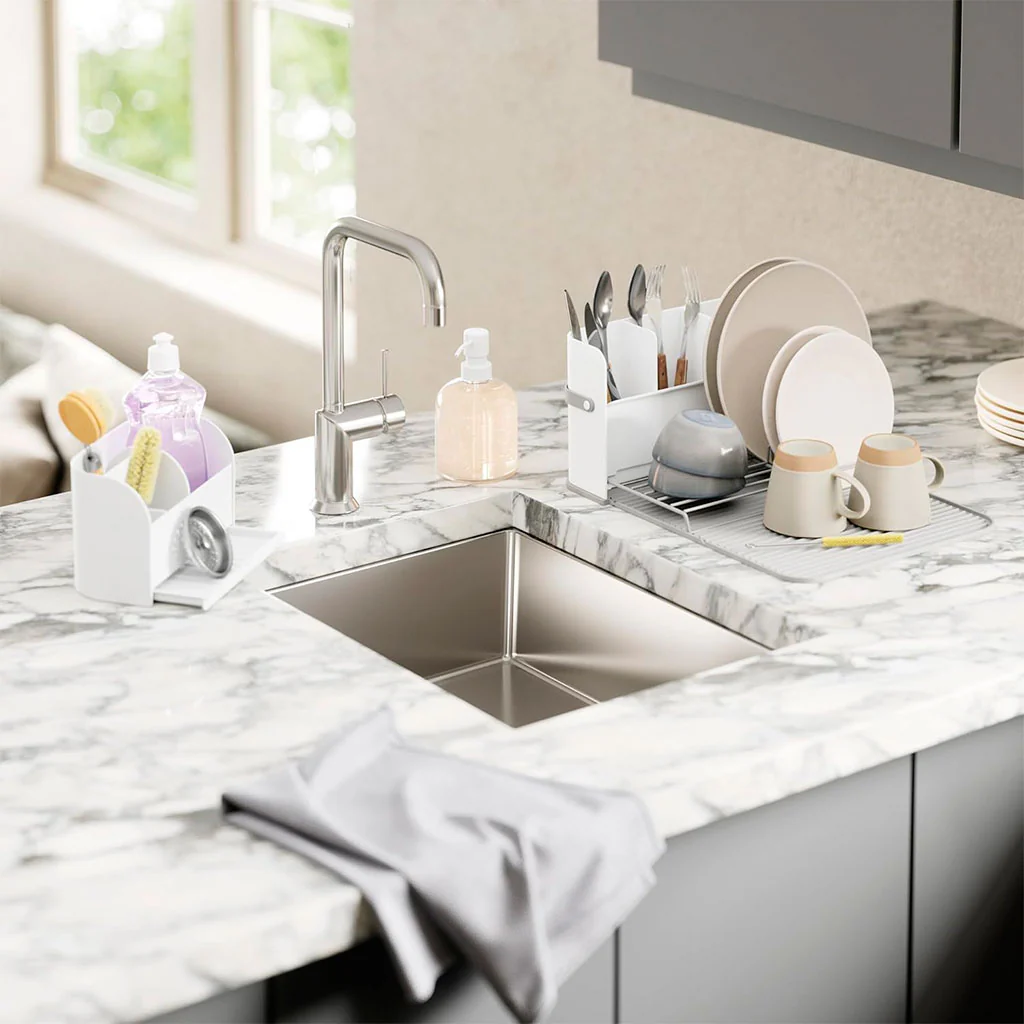 - Es un set ideal para cocinas pequeñas o para los que buscan optimizar el espacio en la zona del fregadero.