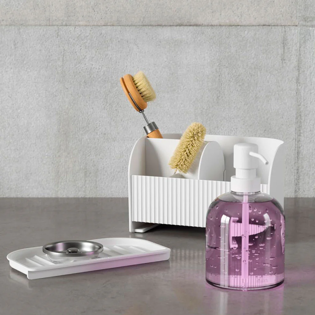 Pero además de práctico, este set de jabonera es de lo más higiénico, ya que su base con ranuras evita que se acumule agua, manteniendo el área limpia y seca en todo momento. Su tamaño compacto hace que encaje perfectamente en cualquier fregadero sin ocupar demasiado espacio, ideal para cocinas más pequeñitas o si estás buscando ahorrar espacio en la zona del fregadero. ¡Encontrarás orden, limpieza y comodidad en un solo accesorio!