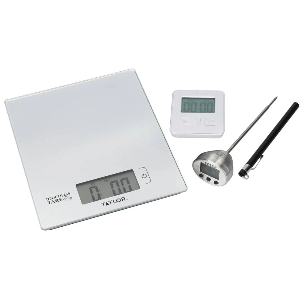 Termómetro, temporizador y balanza, tres utensilios que incluye el Set de medición de 3 piezas Taylor. Un conjunto perfecto para que puedas medir ingredientes y controlar el tiempo y temperatura de tus recetas con total precisión y de manera rápida y muy cómoda. Con este set lo tendrás todo para que nada falle al preparar tus mejores platos y postres.