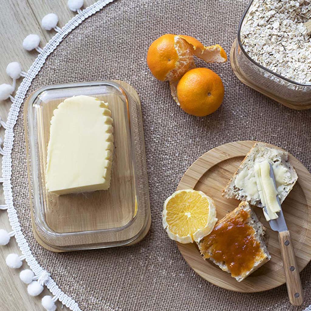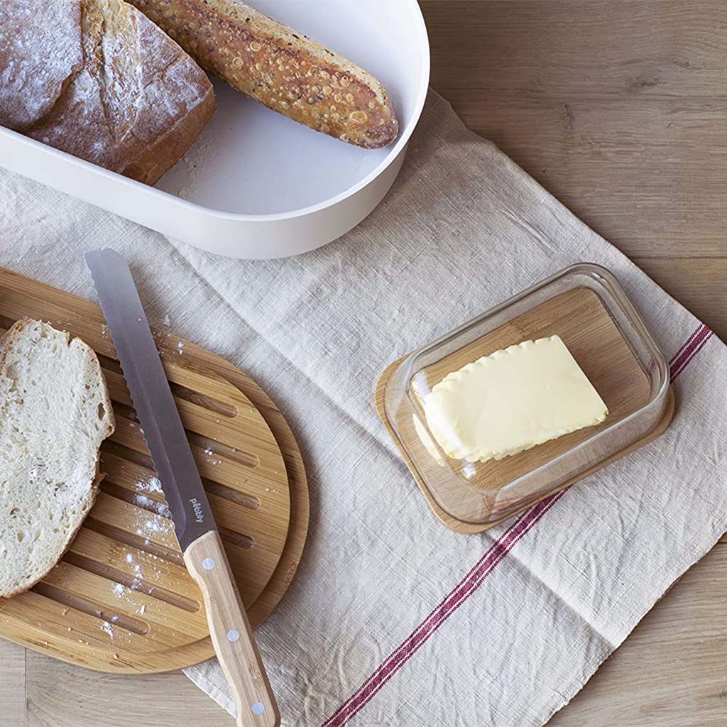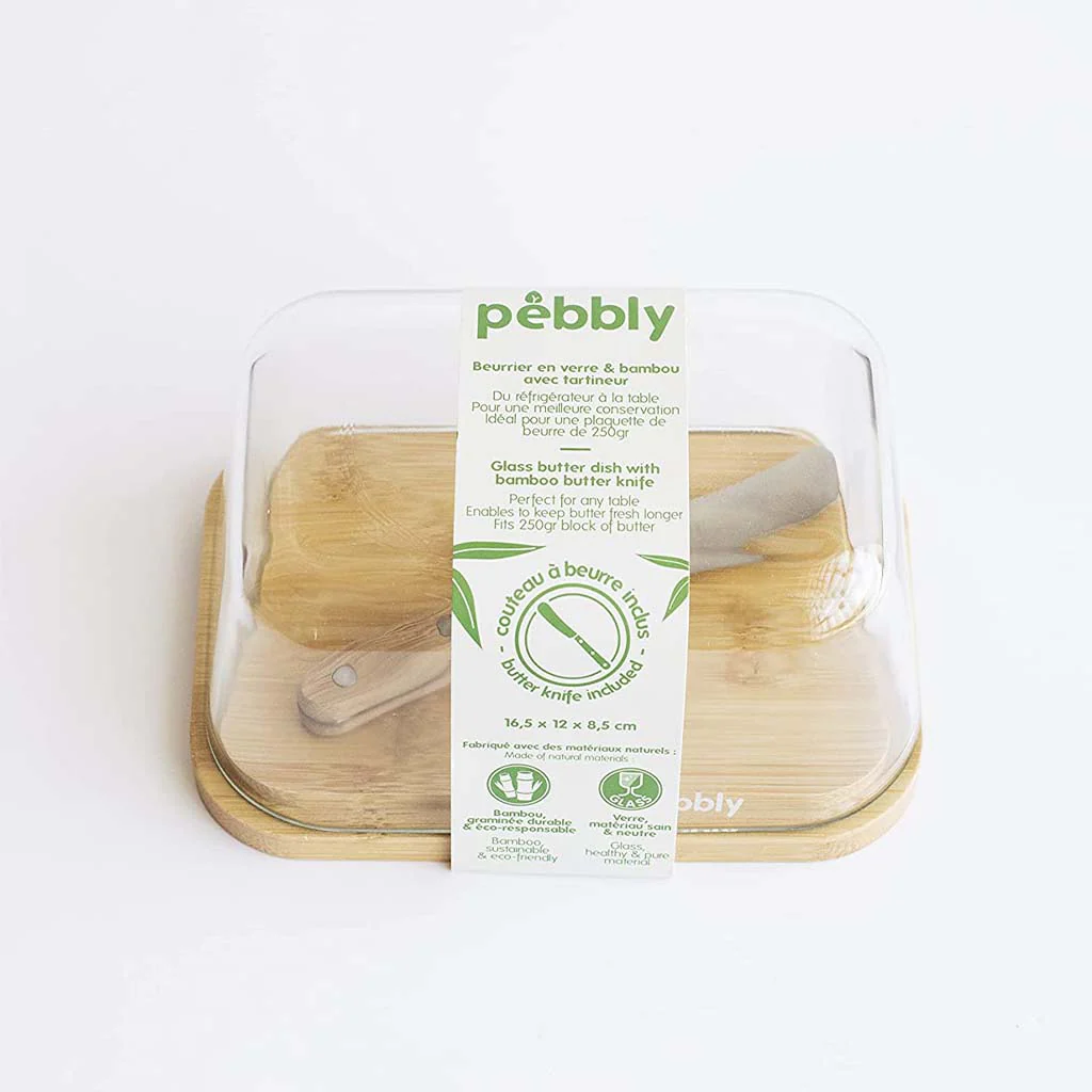 El Set de mantequillera y cuchillo de Pebbly es el conjunto ideal para tus desayunos. La base de bambú de la mantequera protegerá la mantequilla de la humedad y las bacterias y la tapa de cristal garantizará su conservación óptima. El cuchillo es la herramienta imprescindible para que puedas disfrutar del mejor momento de la mañana.