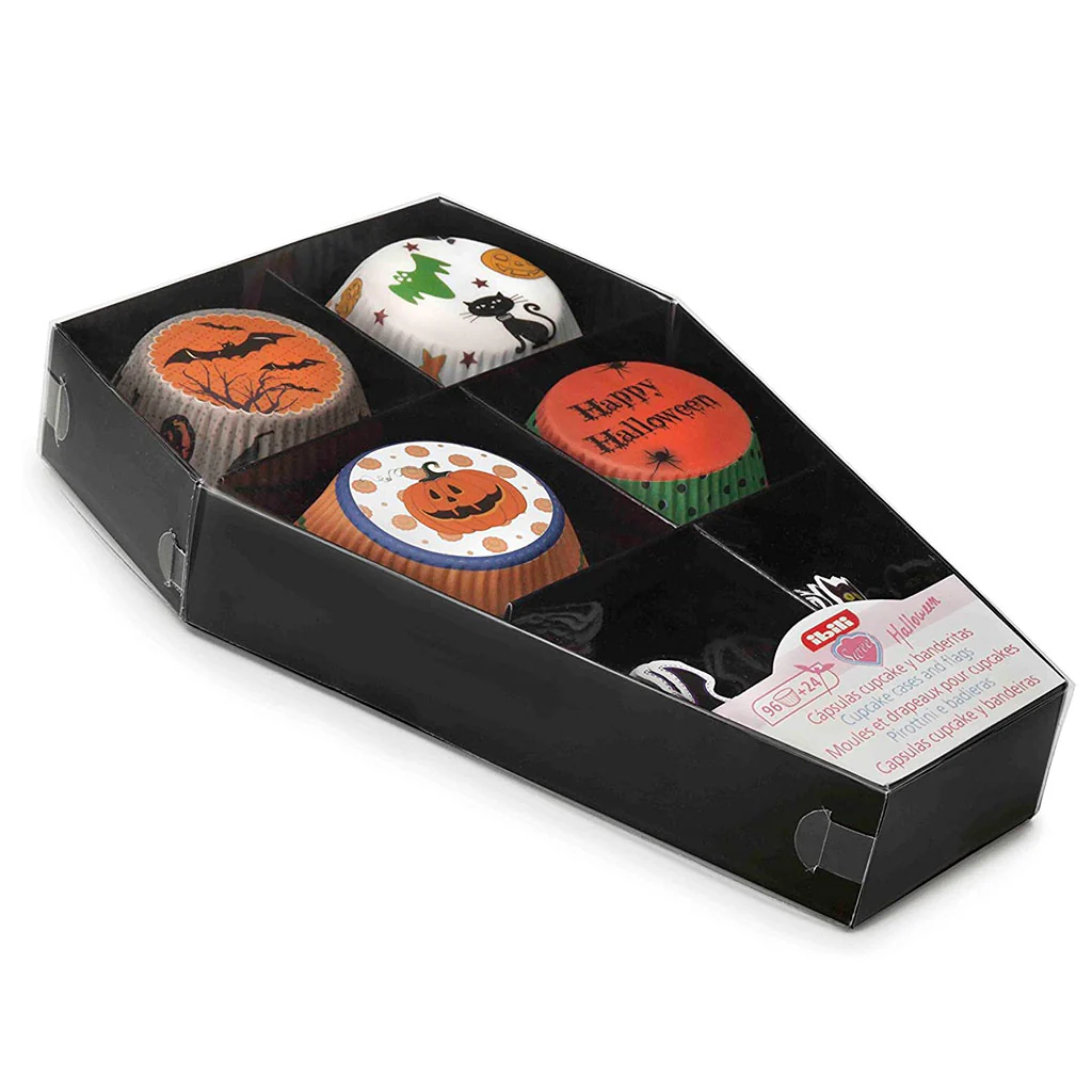 El pack se presenta en una divertida caja con forma de ataúd y está formado por 96 cápsulas y 24 banderitas con diseños variados: gatos negros, arañas, murciélagos, fantasmas y calabazas decorarán tus cupcakes, para deleite de los más peques de la casa.