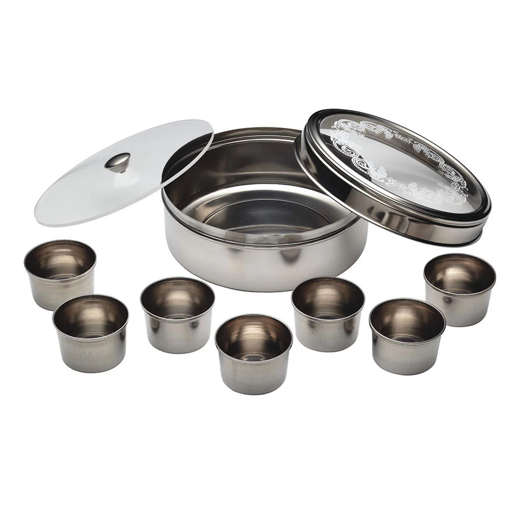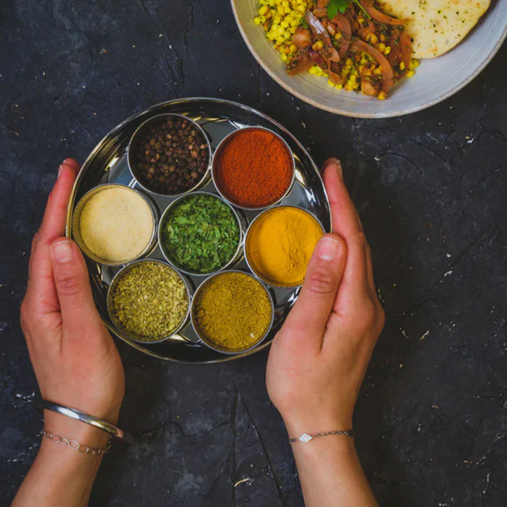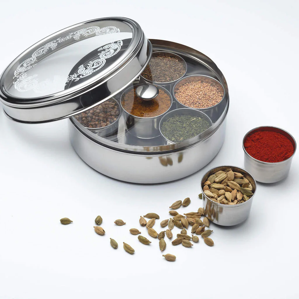 El set está fabricado en resistente acero inoxidable siguiendo el estilo tradicional de un dabba indio de doble tapa, y es una excelente forma de organizar las especias sueltas, manteniéndolas frescas, seguras y de fácil acceso. Además, el doble compartimento te asegura mantenerlas aisladas y que no haya mezcla de olores en la cocina, mientras te asegura un almacenamiento limpio y seguro.
