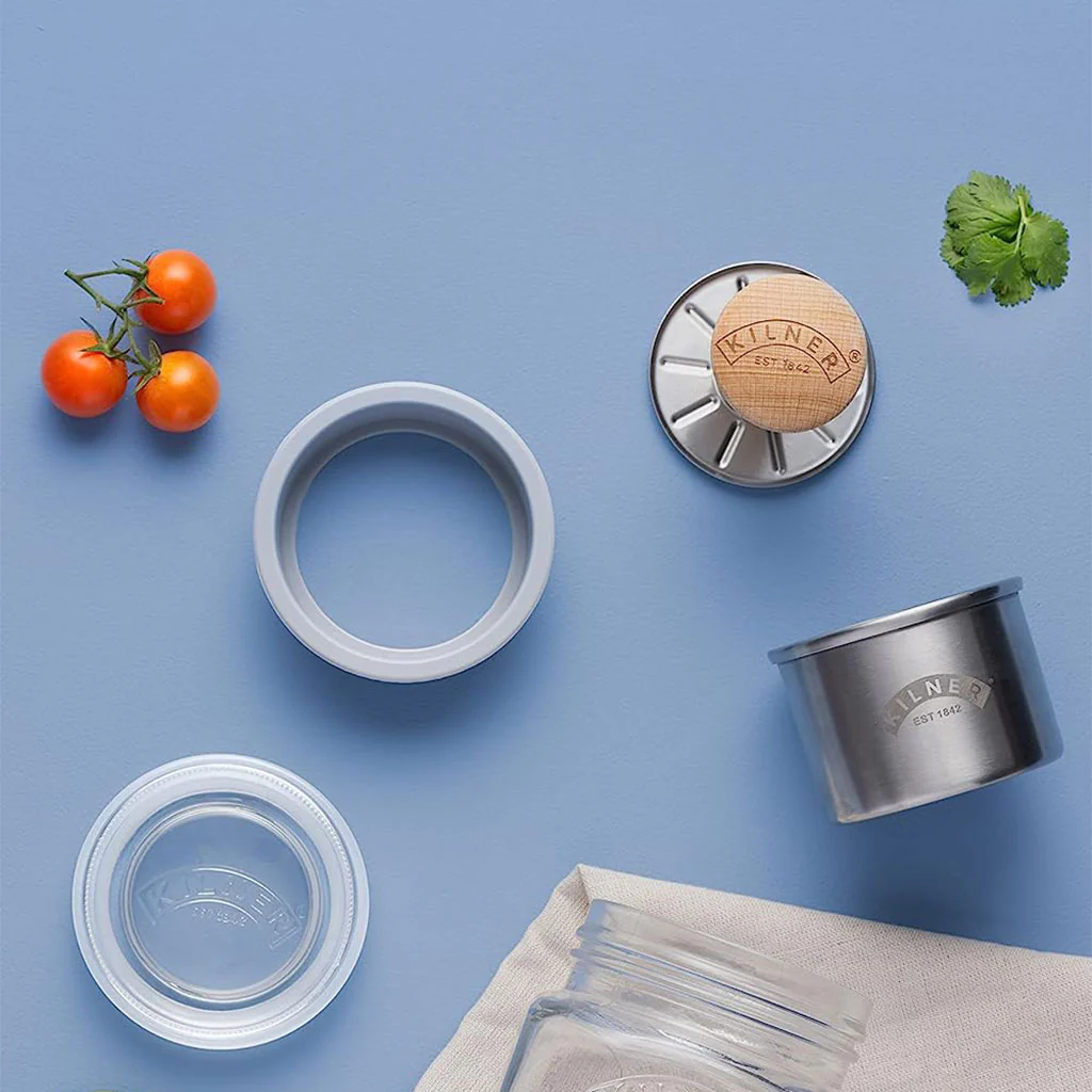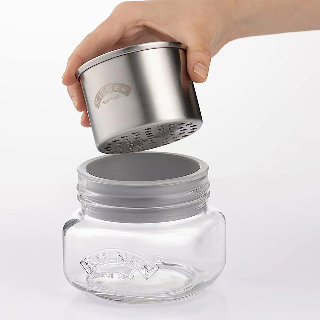 - Tarro de vidrio cuadrado Kilner® de 500 ml. El bote es de vidrio de alta calidad, claridad impecable y grosor de pared consistente, que asegura que no haya puntos débiles. La tapa es de vidrio y tiene una junta de silicona. El cierre del frasco es a presión y ayuda a mantener el contenido fresco.