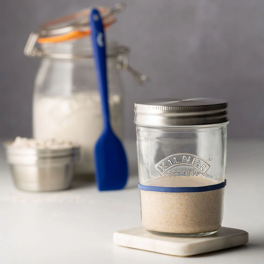 El Set para masa madre de Kilner® es un práctico pack con todos los accesorios necesarios para que puedas preparar, refrescar y mantener tu masa madre. El conjunto incluye dos tarros de vidrio con tapa, una espátula y una tapa de medición para que puedas hacer en casa tu levadura 100% natural y tenerla lista para preparar tus mejores masas.