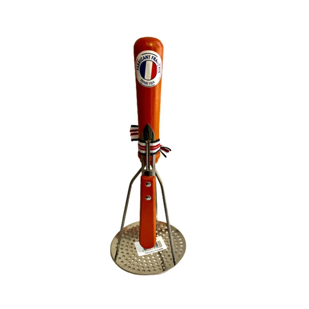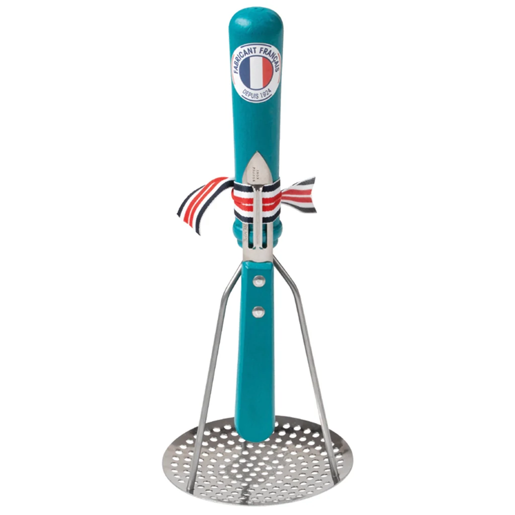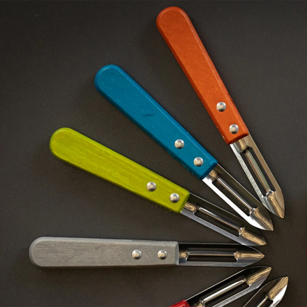 Tanto el pelador como el prensapatatas son de acero inoxidable. Los mangos son de madera de haya y se presenta en varios colores, para que puedas elegir el que combine con tu cocina o el que más te guste.