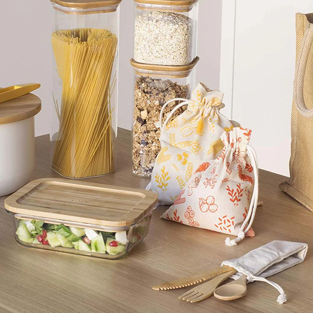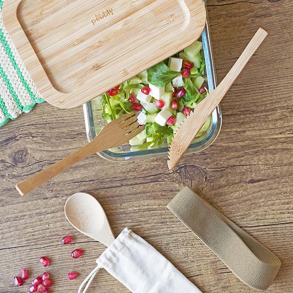 El Set Take Away de Pebbly es un conjunto ideal para llevar tu comida y comer fuera de casa sin complicaciones. Formado por un juego de cubiertos de bambú, bolsa de algodón y un recipiente de cristal con tapa de bambú y banda elástica de sujeción. Un conjunto práctico ¡y de lo más encantador!