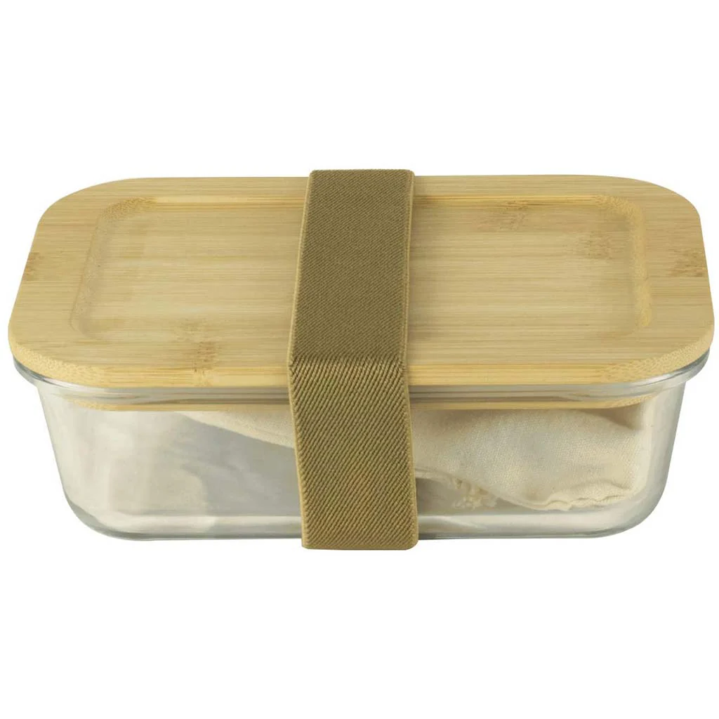 - La tapa del recipiente es de bambú y su junta de silicona permite un cierre seguro, reforzado por la banda, para que puedas llevar tus ensaladas, arroz, pasta o fruta sin miedo a que se pueda abrir.