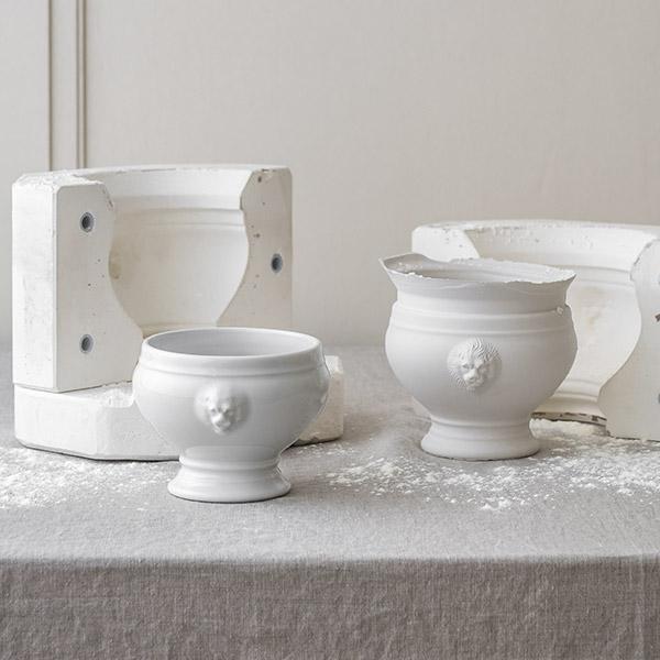 Las dos cabezas de león de los laterales decoran cada una de las piezas, a la vez que se convierten en el punto de apoyo perfecto si se quiere coger la sopera. Además, la sopera se erige sobre su pie de porcelana, esbelto y elegante.