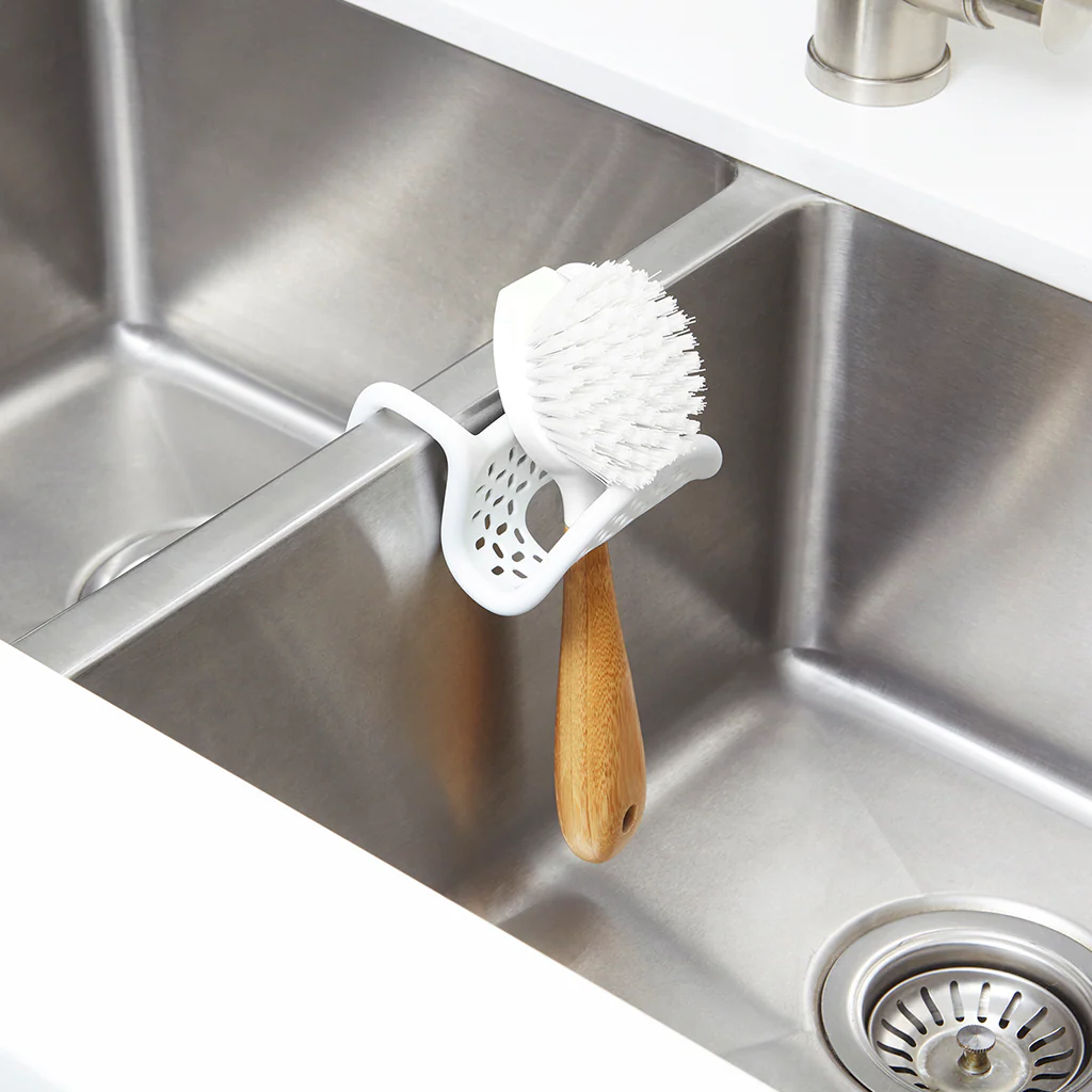 Su cestillo minimalista es ideal para dejar la esponja y el agujero central es perfecto para encajar el cepillo de limpieza sin problemas, manteniéndolos limpios y secos, gracias a su base perforada que evita la acumulación de humedad.