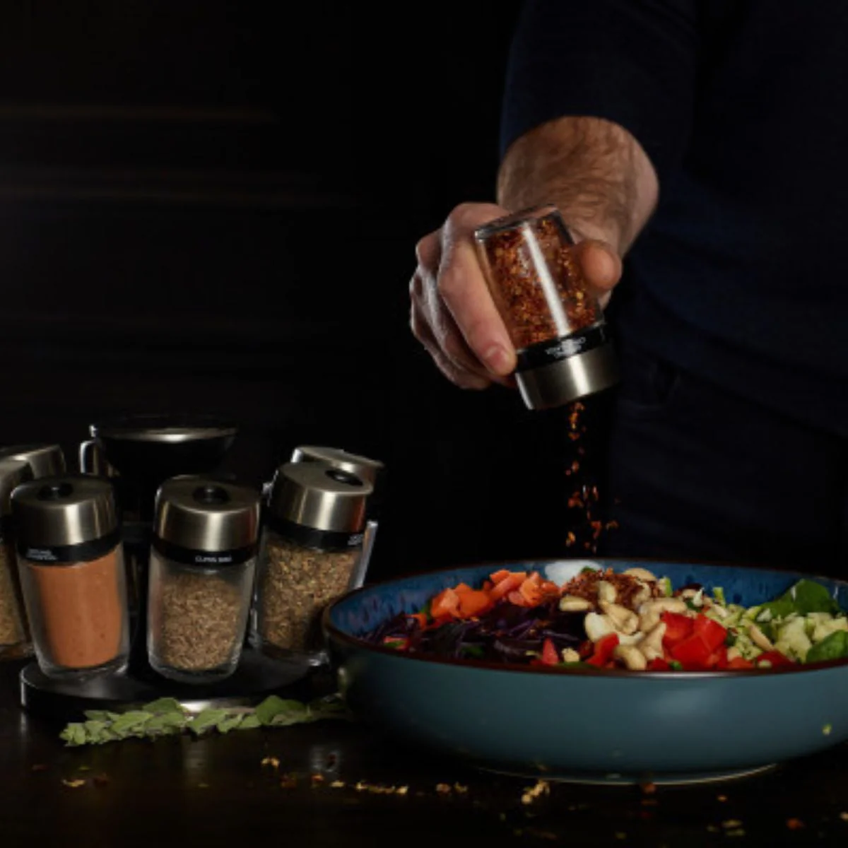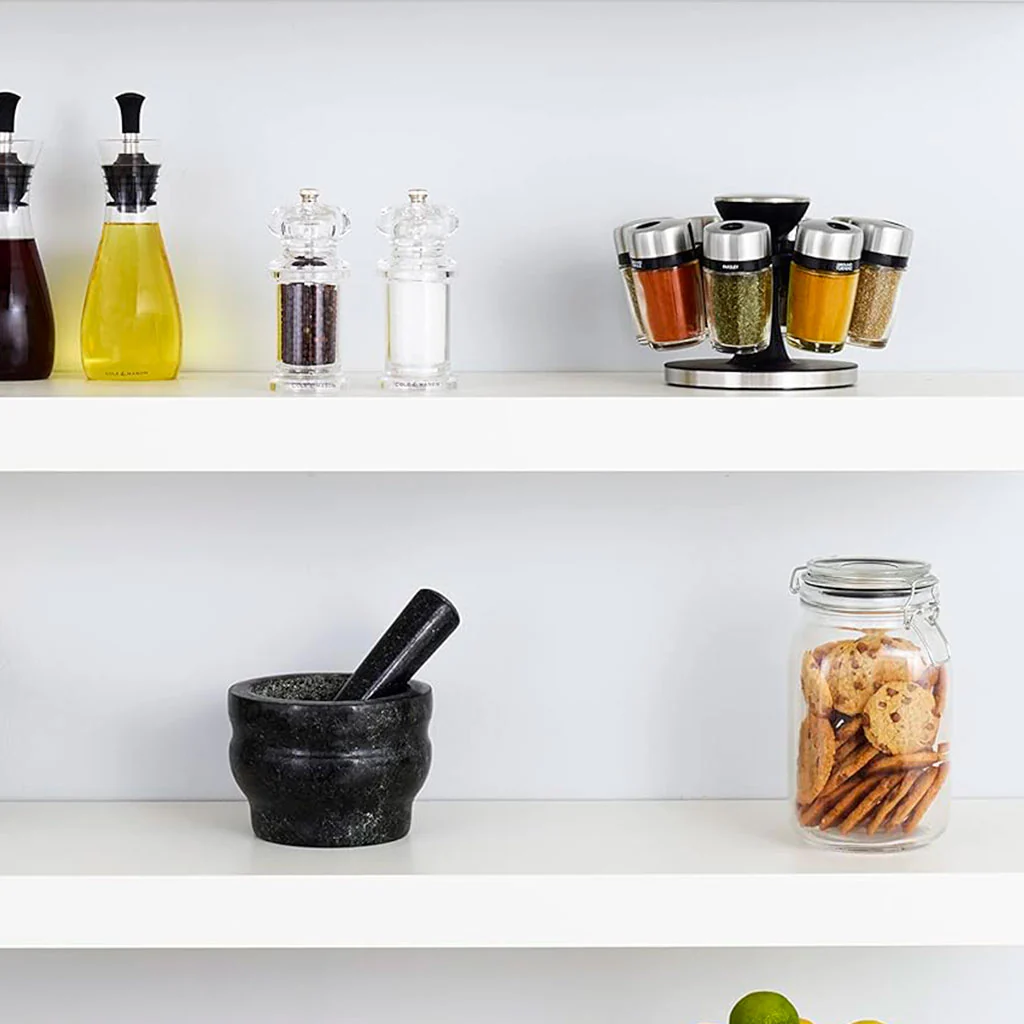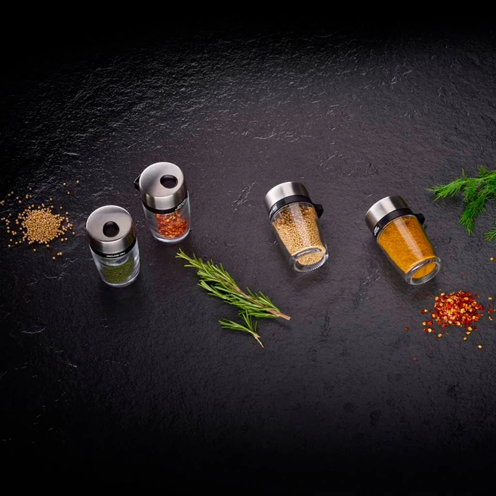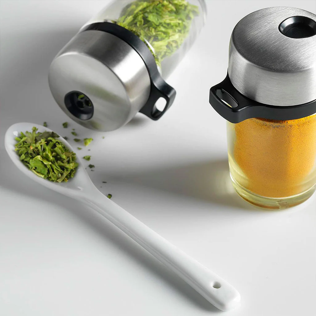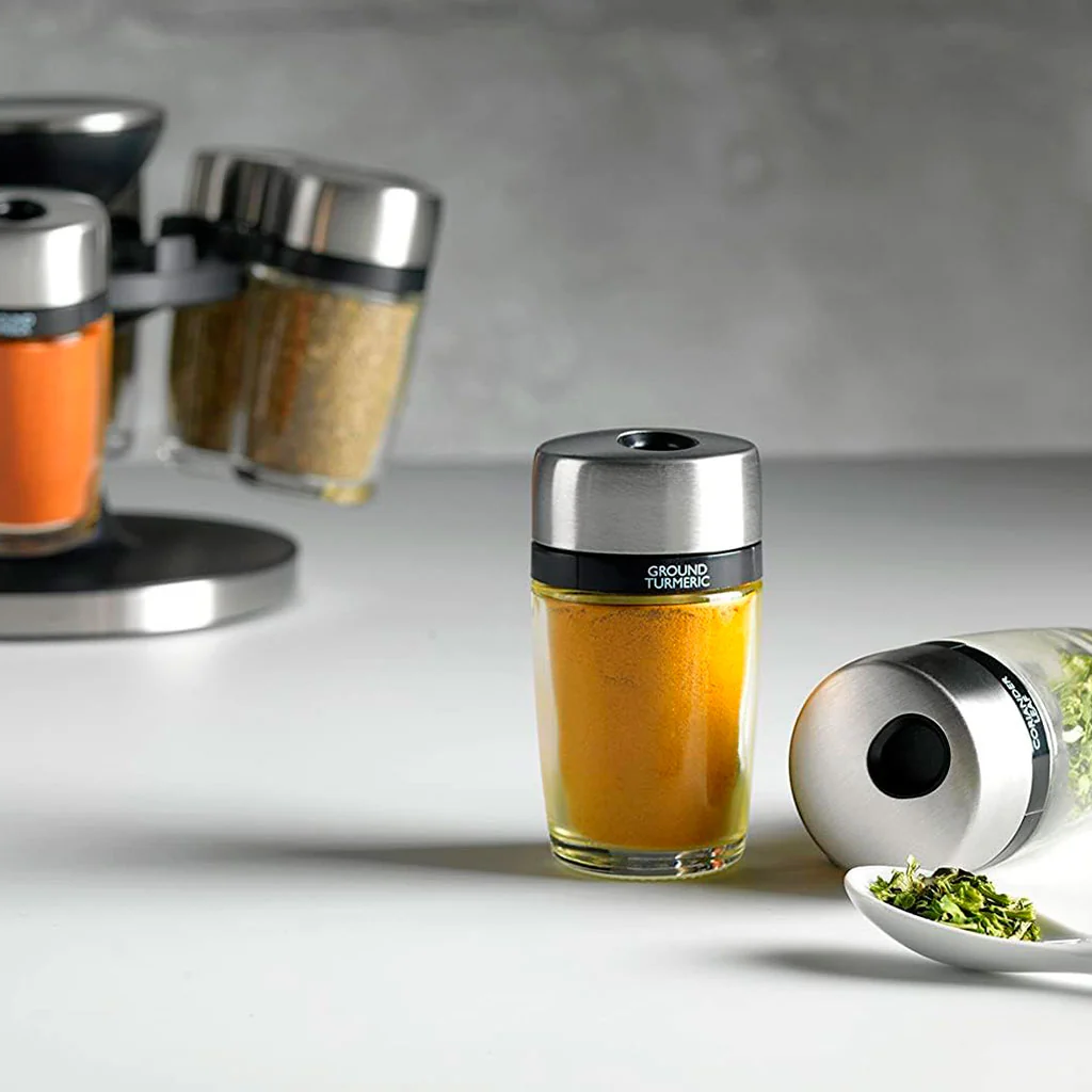 Fabricado con una base de plástico resistente y frascos de vidrio reutilizables, este carrusel es ideal para ti si buscas un accesorio que combine practicidad, organización y estética. Su sistema escalonado garantiza que cada frasco esté siempre visible, y las tapas ajustables de acero inoxidable permiten un vertido preciso de cada especia. Además, el contenido de cada frasco está impreso en la parte superior de la tapa para que puedas identificarlos cómodamente y hacer de tus momentos en la cocina mucho más fáciles.