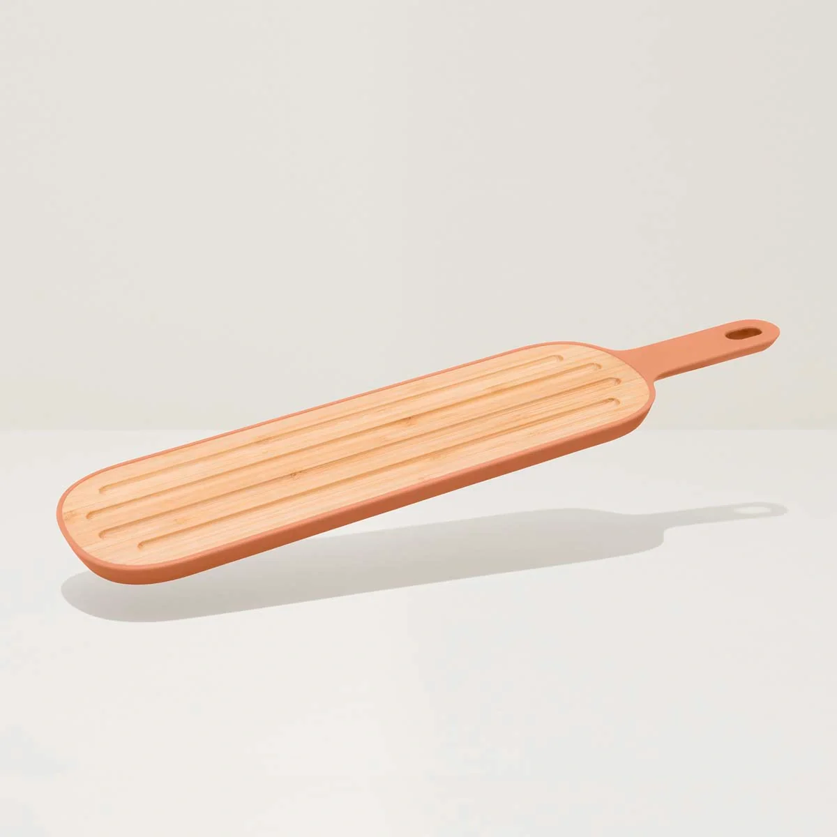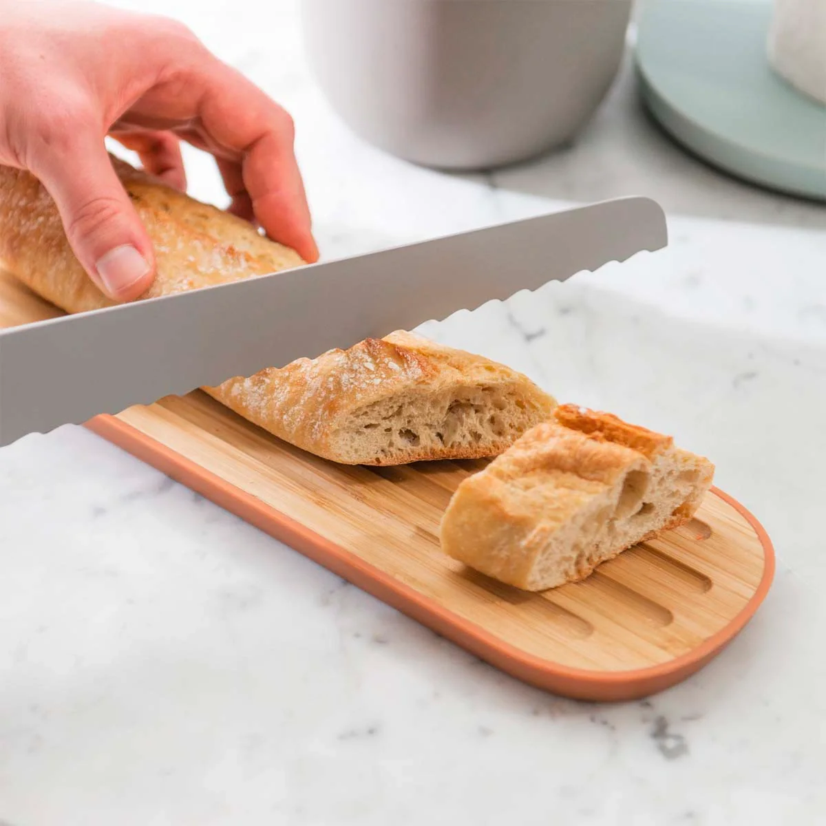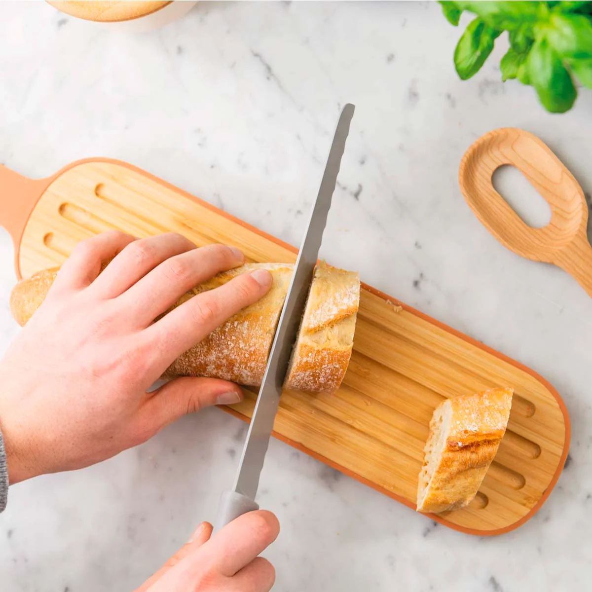 Esta tabla de cortar tiene el tamaño perfecto para rebanar una baguette o barra de pan cómodamente en la mesa o en la encimera de la cocina. Además, cuenta con una superficie con ranuras que permite que las migas resultantes de rebanar queden allí y así se evita que se extiendan por la superficie.