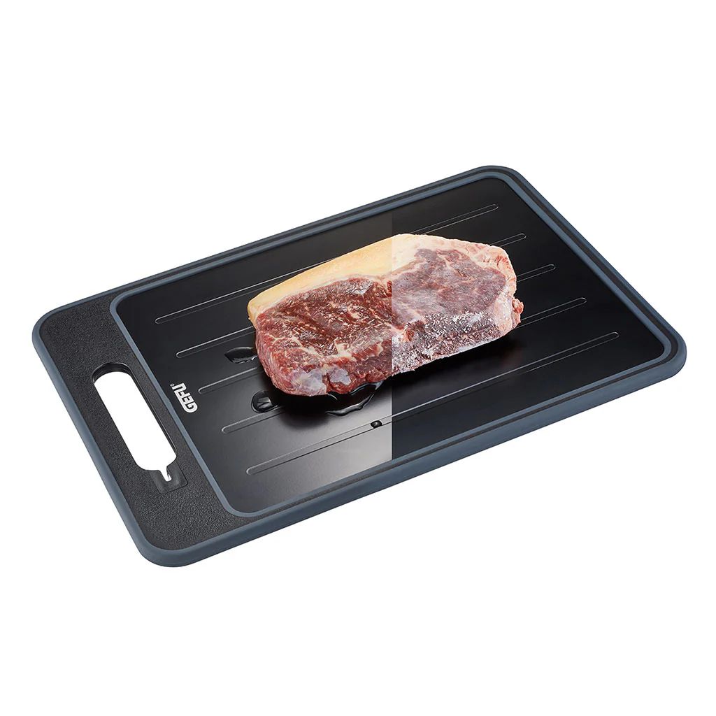 - La superficie de descongelación de la tabla es perfecta para descongelar todo tipo de alimentos. La superficie de aluminio con revestimiento negro reduce el tiempo de descongelación en hasta un 60%, sin que el alimento pierda calidad o sabor.