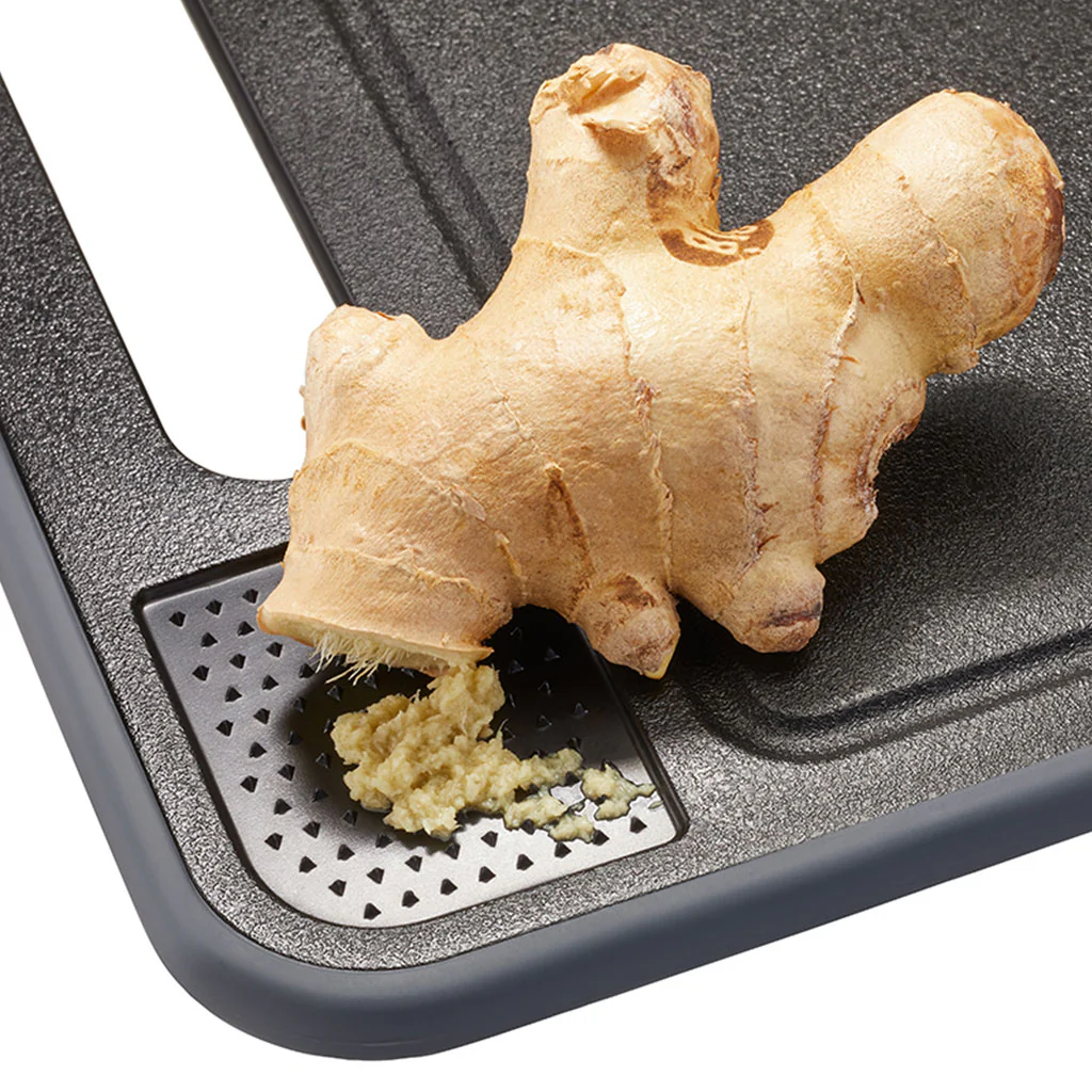 - Rallador fino integrado en la esquina superior de la superficie de corte, perfecto para pieles de cítricos, ajos o jengibre.