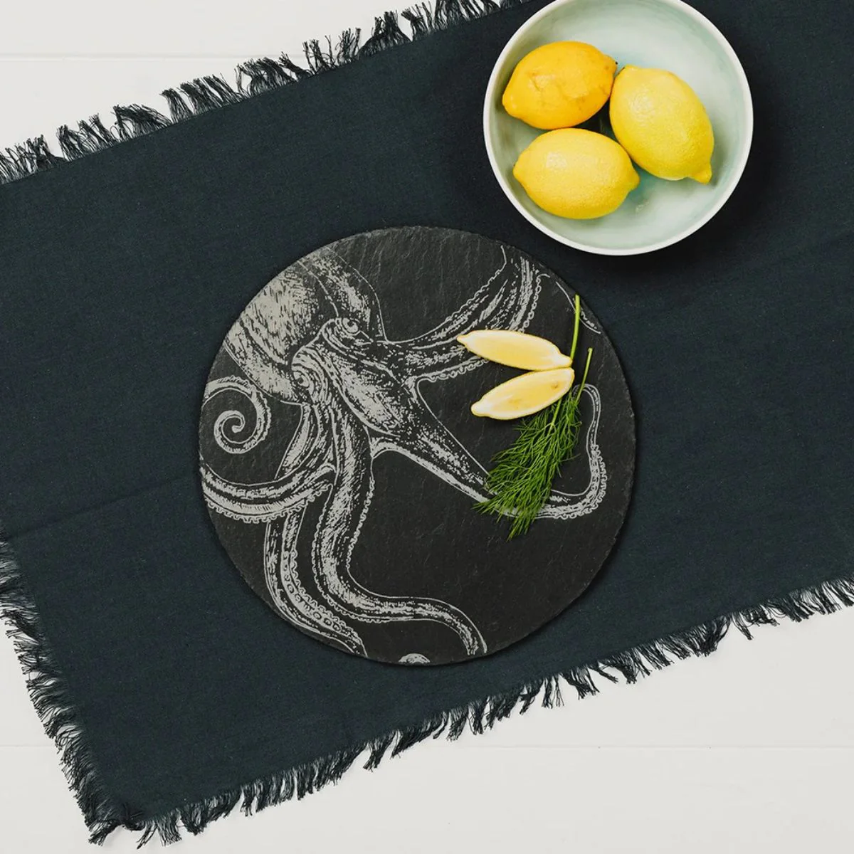 Déjate seducir por el elegante diseño de la Tabla redonda para quesos y aperitivos de pizarra Selbrae. Este precioso plato de pizarra natural, hecho a mano en Escocia, va a lucir en el centro de mesa como ninguno. La tabla cuenta con el encantador grabado de la imagen de un pulpo ilustrada a mano. Por su fabricación artesanal, cada tabla es una pieza única e irrepetible. Sin duda es ideal como bandeja para llevar a la mesa una buena ración de pulpo a la gallega, y también es perfecta como tabla o plato para presentar quesos, embutidos o aperitivos variados, o entrantes fríos o calientes. Una tabla preciosa, original, única y de gran calidad.