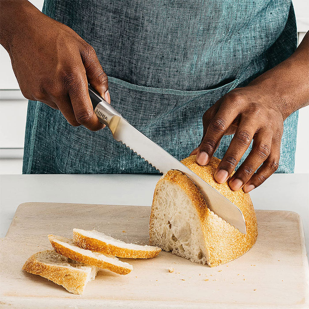- Cuchillo para pan de 20 cm con hoja dentada. Corta fácilmente todo tipo de pan, brioches, panes de molde o piezas de bollería. También es ideal para cortar frutas y verduras de piel blanda, como los tomates, o dura como las berenjenas.