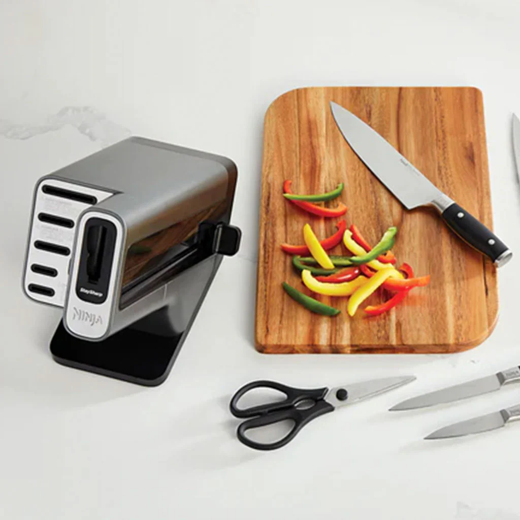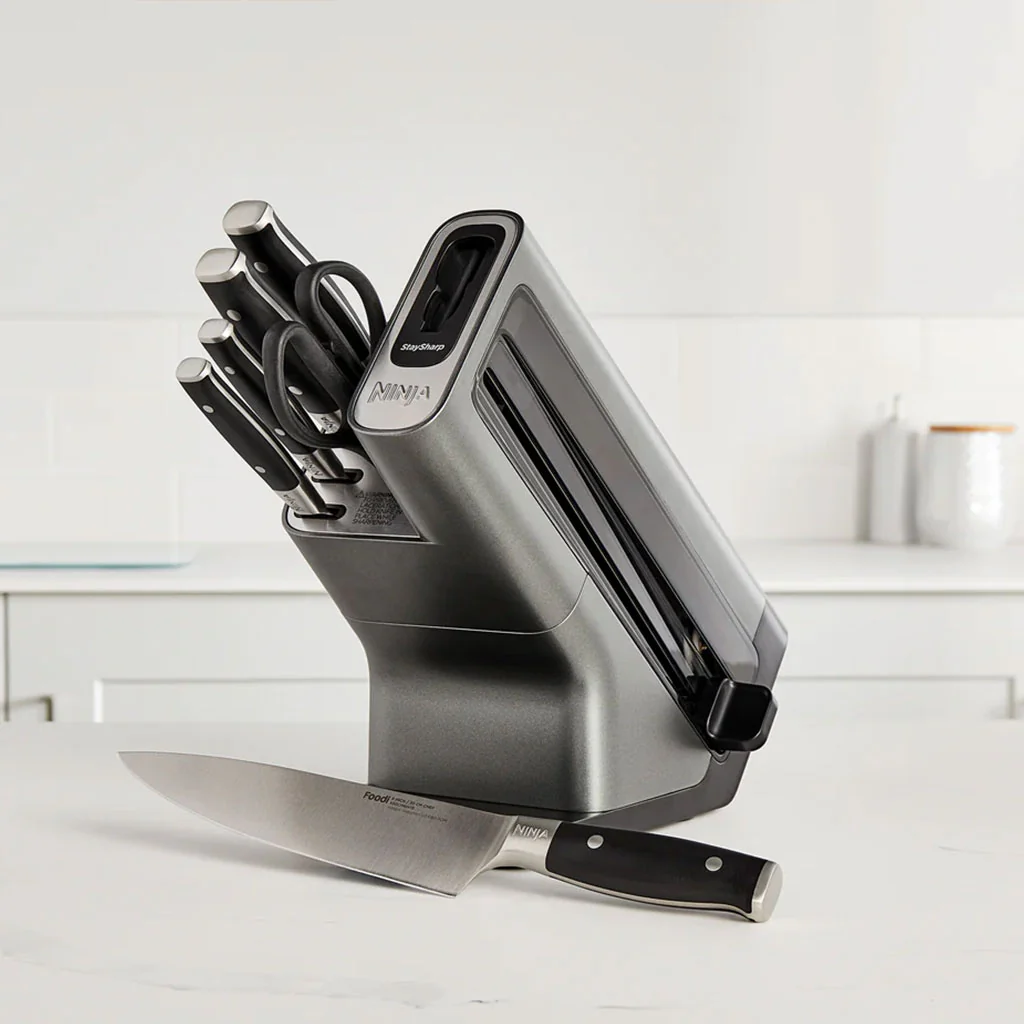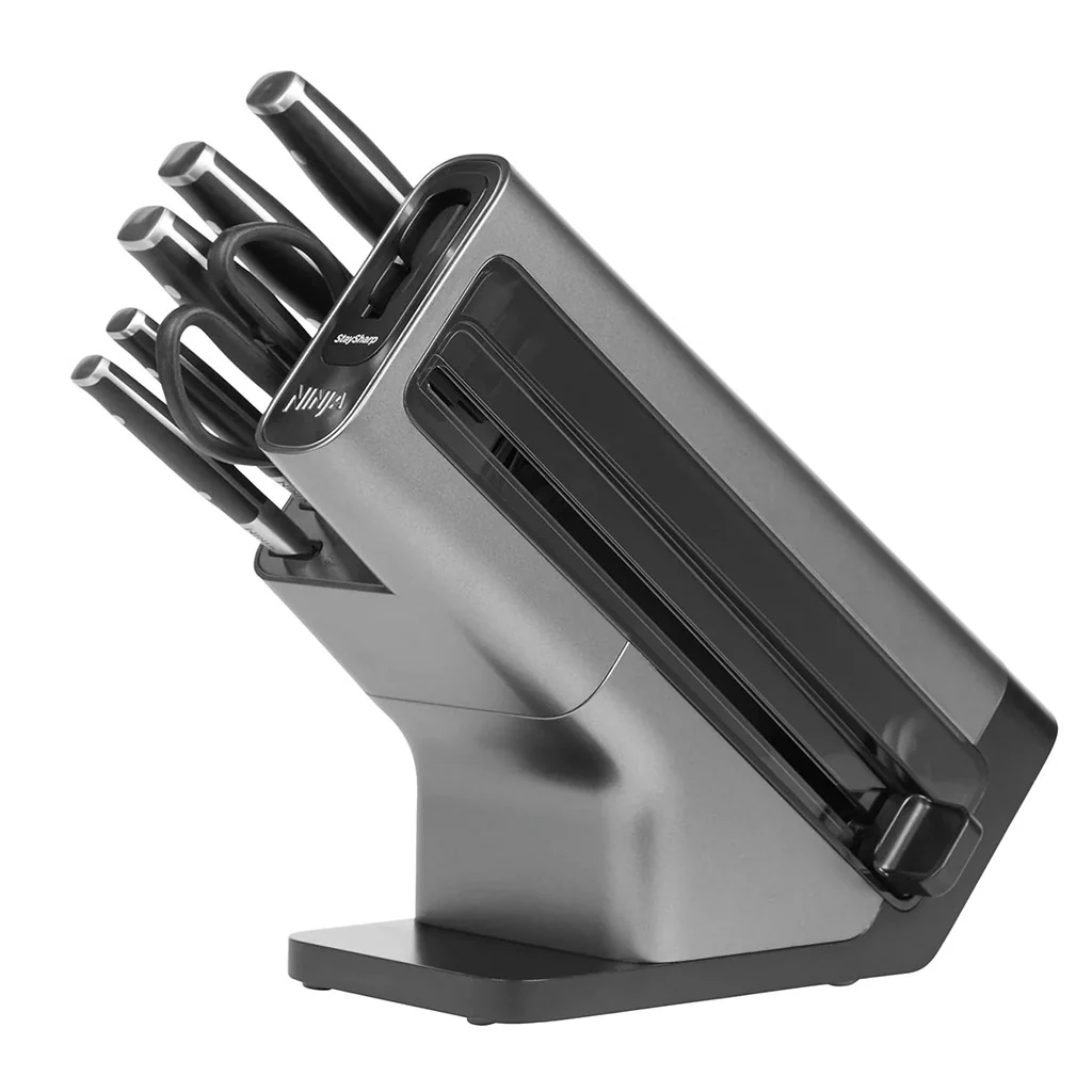 El juego de taco con cuchillos y afilador Ninja® combina funcionalidad y estilo. Los mangos ergonómicos garantizan un agarre cómodo y seguro, mientras que las hojas de acero inoxidable ofrecen un corte preciso y eficiente y una durabilidad excepcional. El taco te permitirá tenerlos siempre ordenados y a mano y con el afilador integrado estarán siempre tan afilados como el primer día.