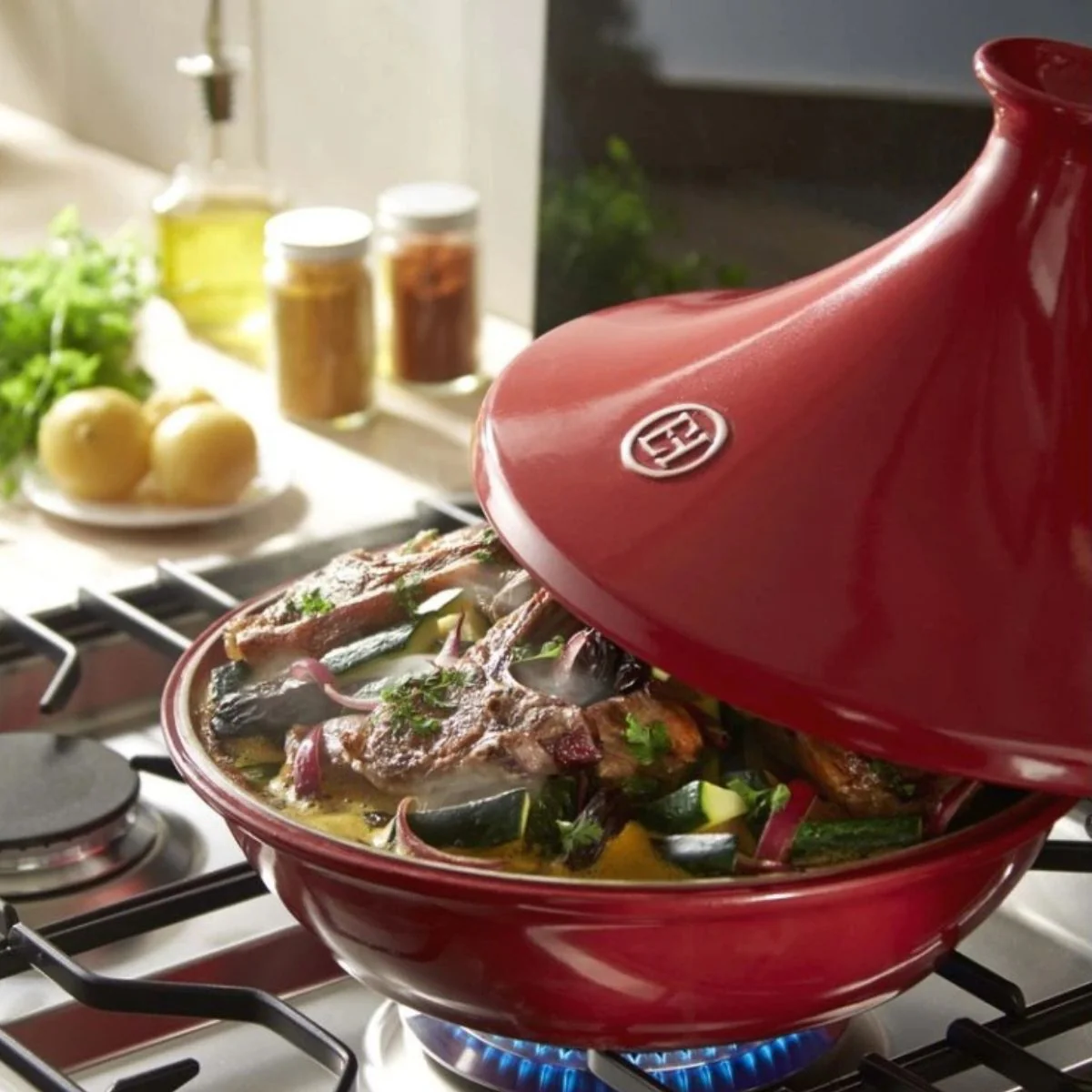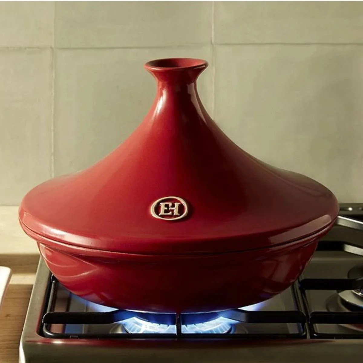 ¡IMPORTANTE! El Tajine Emile Henry puede ir al fuego (gas o vitrocerámica tradicional) y también al horno, y se puede lavar en el lavavajillas. No es apta para inducción.