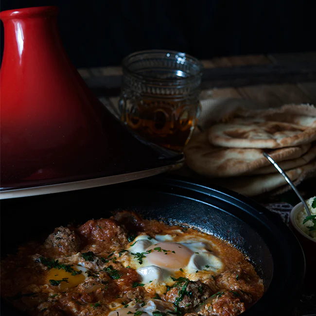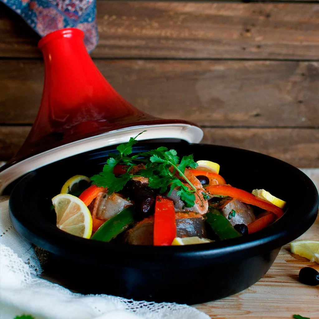 - El secreto de la Tajine es el diseño cónico de la tapa cerámica, que concentra la humedad en su interior y permite una circulación del vapor que hace que los alimentos permanezcan jugosos durante el largo tiempo de cocción con muy poco agua.