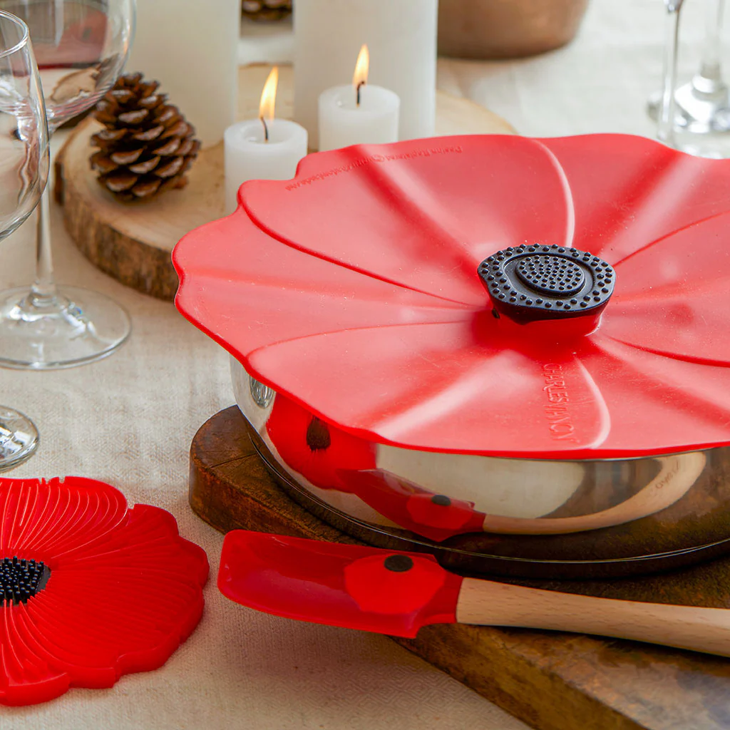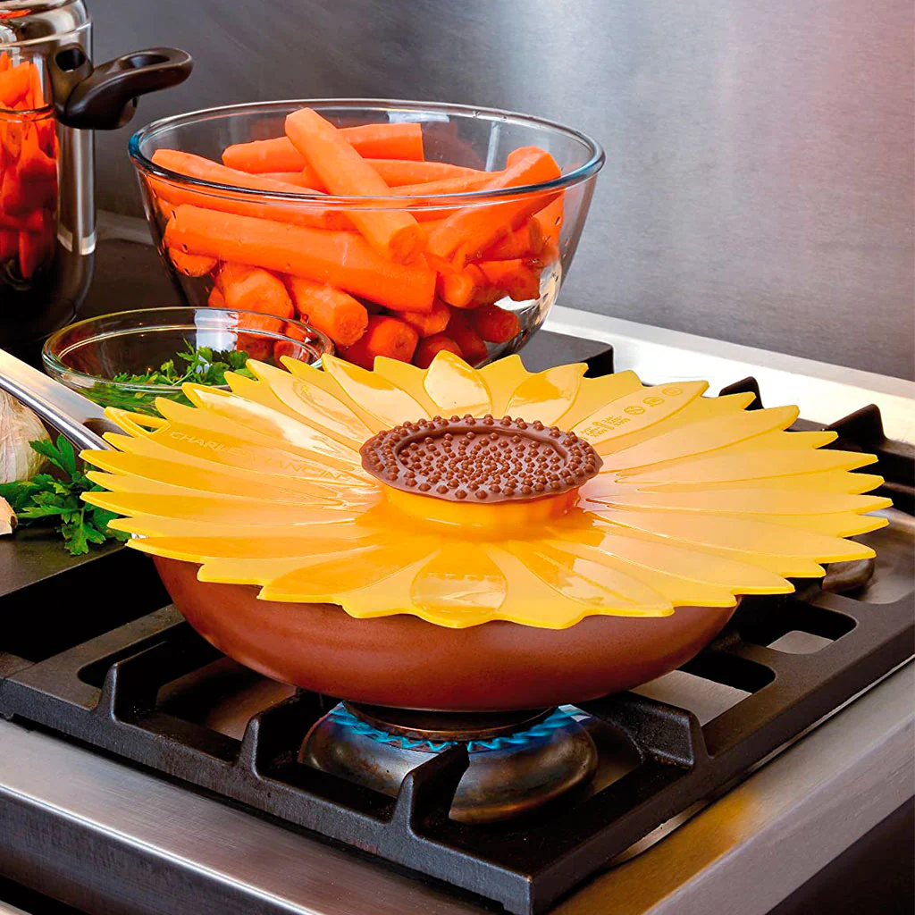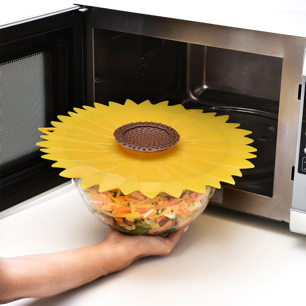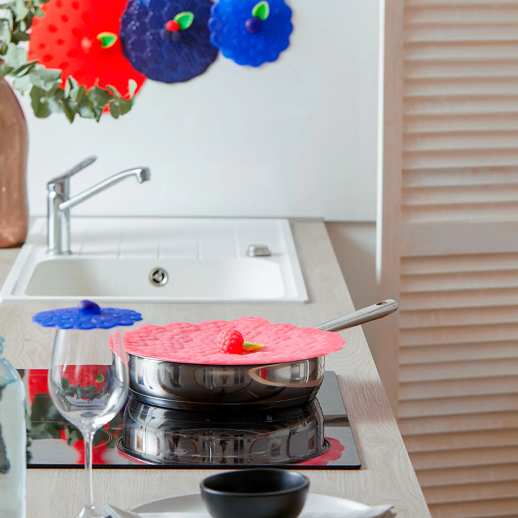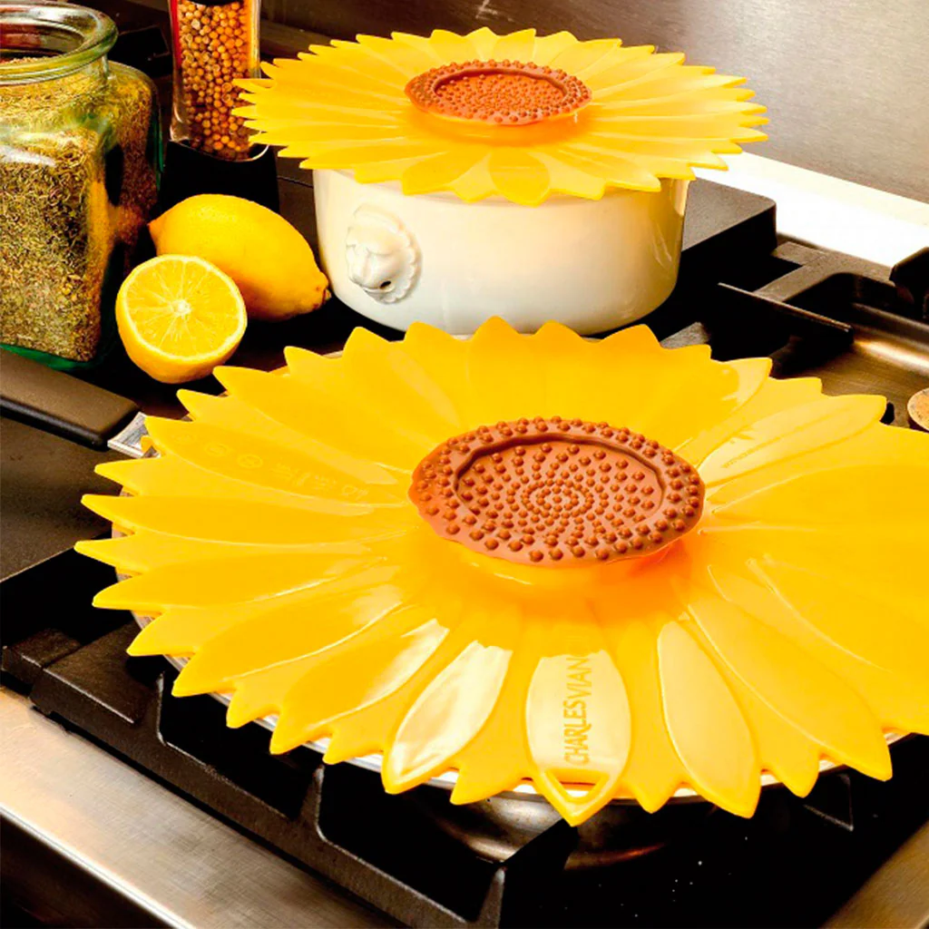 Las tapas de silicona Charles Viancin están disponibles en los diseños amapola, girasol y frutas y verduras, y en cuatro diámetros, de 12 cm (perfectas para tazas, vasos y tarros en el exterior, el frigo y el microondas), 20 cm, 23 cm y de 28 cm.