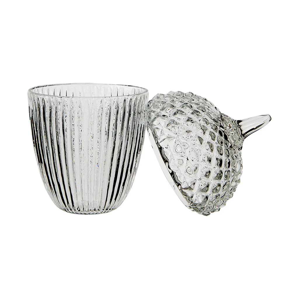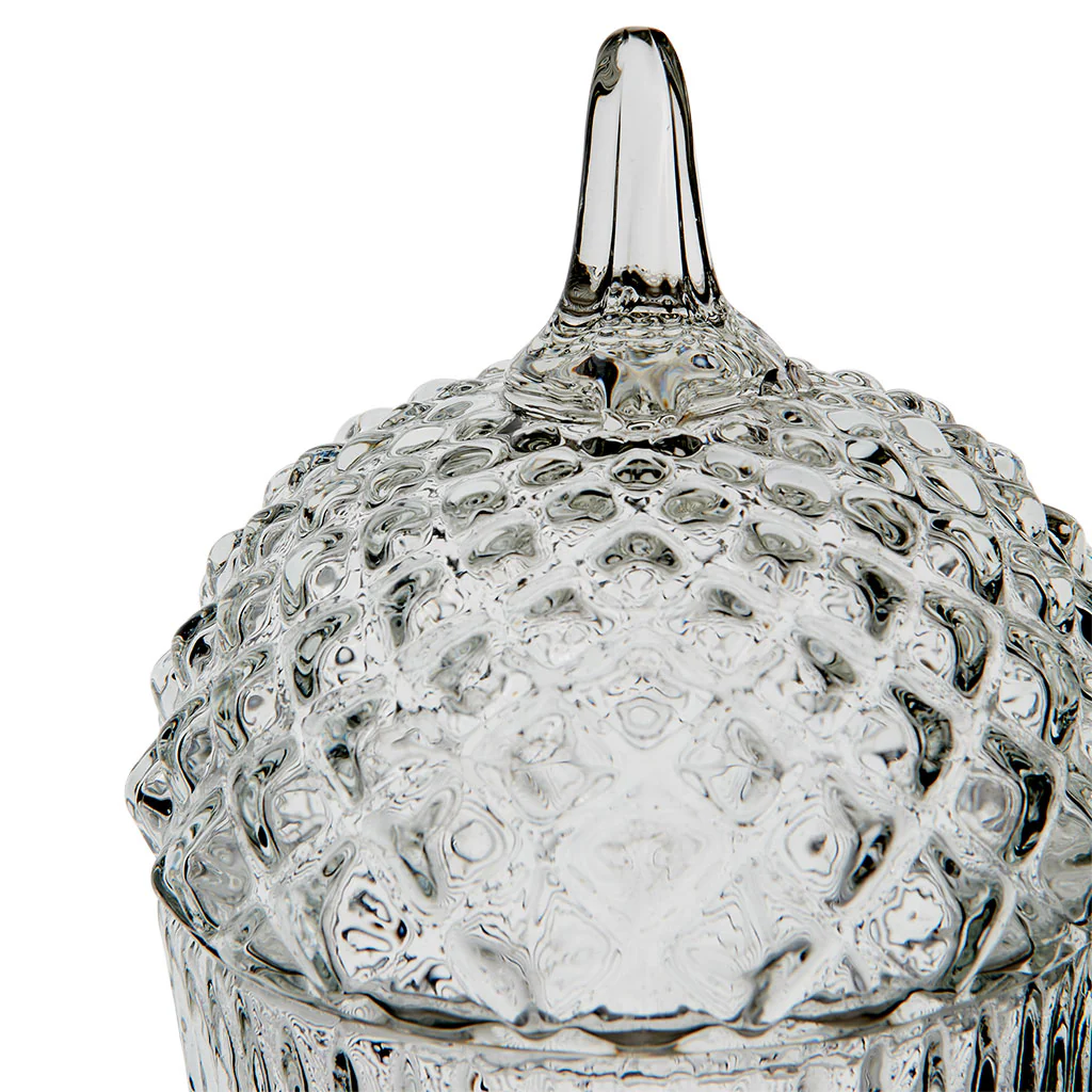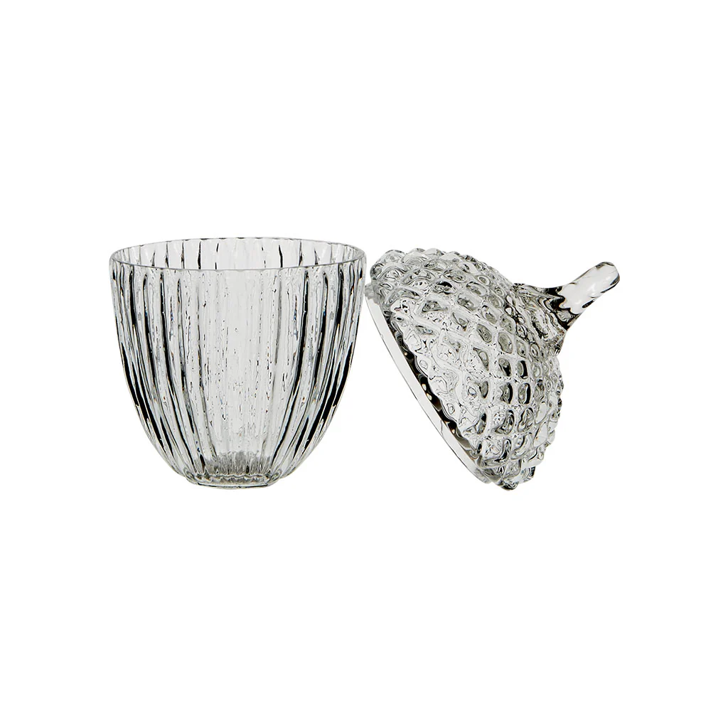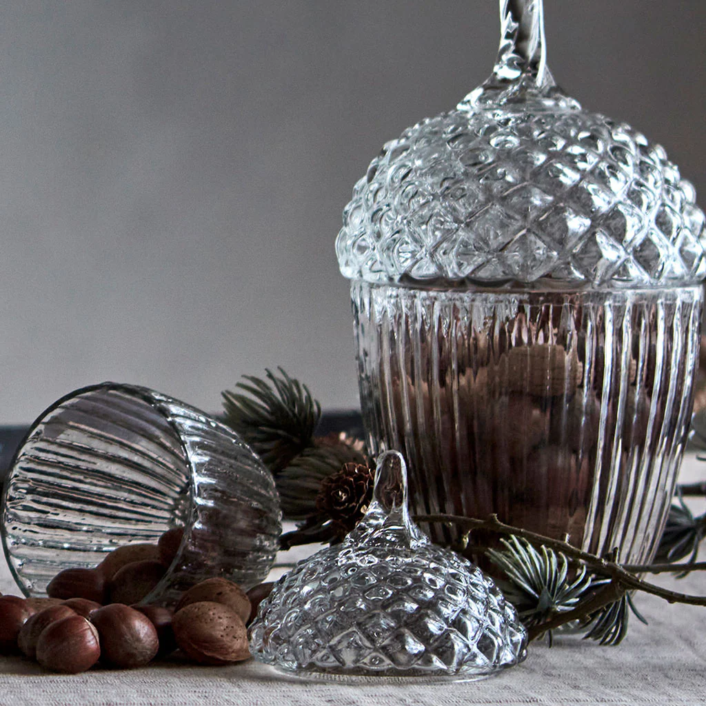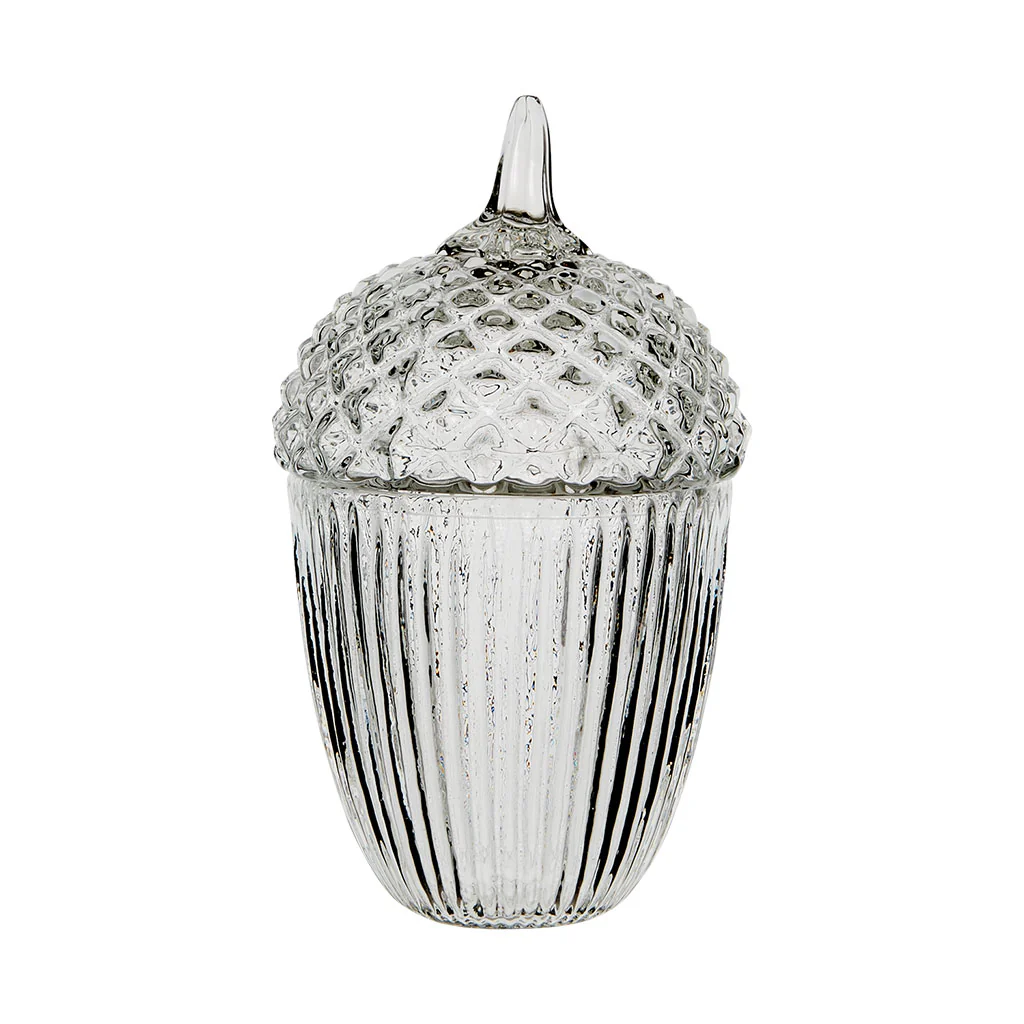 Este recipiente tan elegante como útil, es una pieza preciosa de cristal soplado. A su bonito y original diseño en forma de bellota no le falta ni un detalle, con una tapa que es una auténtica preciosidad. En cualquiera de sus tres medidas, es una opción de lo más ideal no solo para contemplarla como una pieza decorativa, sino para usarla a diario, atesorando tus creaciones más dulces.