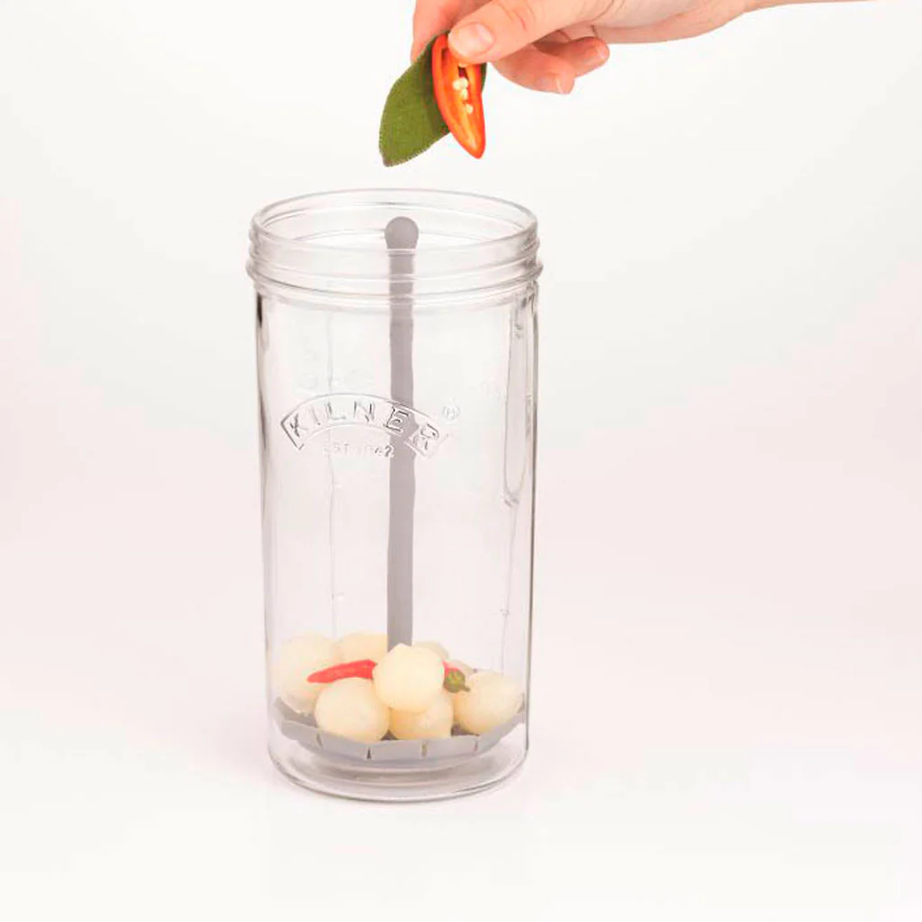 ¡Se acabó intentar atrapar el último pepinillo del bote! Con el Tarro para aceitunas y encurtidos con elevador de Kilner® no tendrás más problemas para sacar del tarro de vidrio hasta la última cebollita encurtida. Gracias al eficiente diseño del elevador, podrás drenar el líquido de tus fermentados y encurtidos de la forma más sencilla.