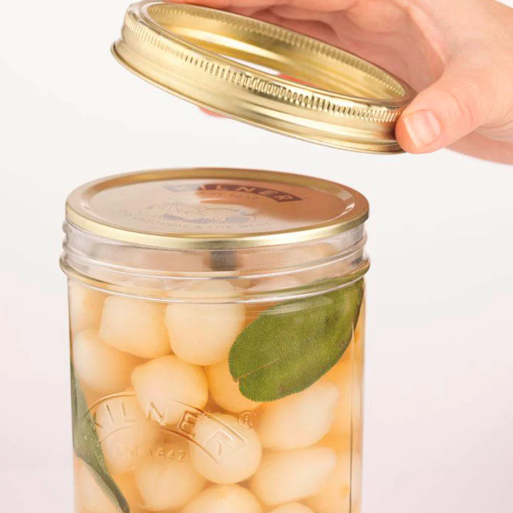 Nota: Si usas el tarro para tus conservas y deseas adquirir las piezas para las tapas de los tarros Kilner® puedes encontrar el set de 12 discos de sellado al vacío Kilner® aquí y el set de 6 anillas con cierre de rosca para el sellado al vacío Kilner® aquí.