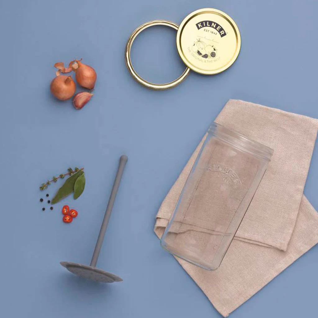 El tarro para aceitunas y encurtidos con elevador de Kilner® es un set de 2 piezas ideal para conservar tanto los encurtidos y fermentados que prepares en casa, como los que compres en tu comercio habitual.