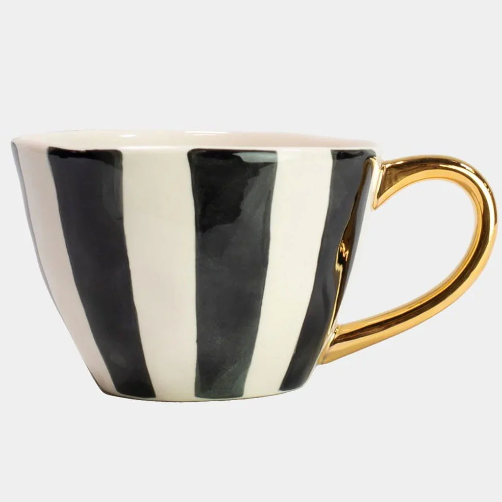 La Taza tipo Capuccino Doris Olsson & Jensen es una taza de cerámica amplia y perfecta para esos cafés largos en los momentos de relax. Con un encantador diseño de franjas negras sobre un fondo blanco, cuenta con una amplia asa dorada que le otorga tanta elegancia como comodidad al sujetarla.