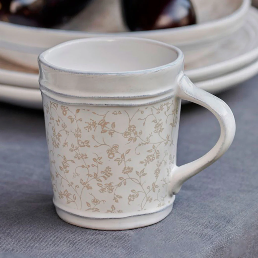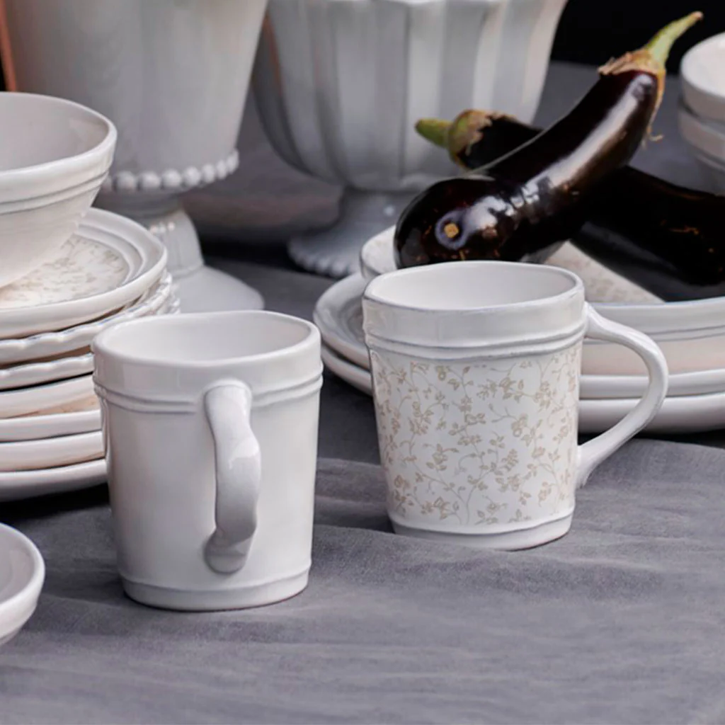 - Taza blanca estampada con sutiles flores en color gris y líneas en el mismo color.