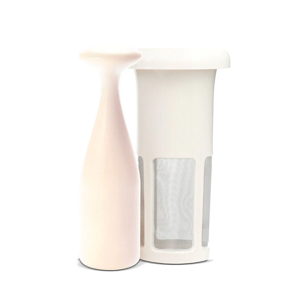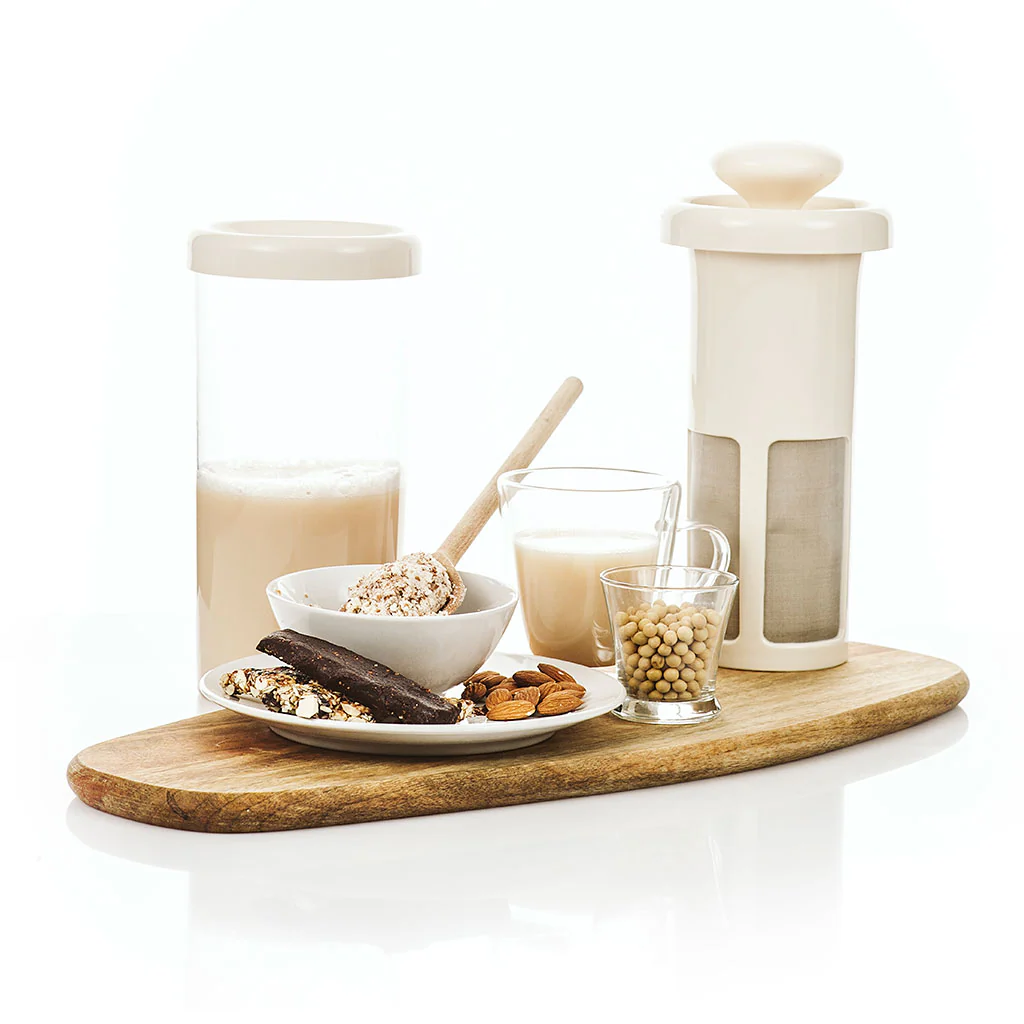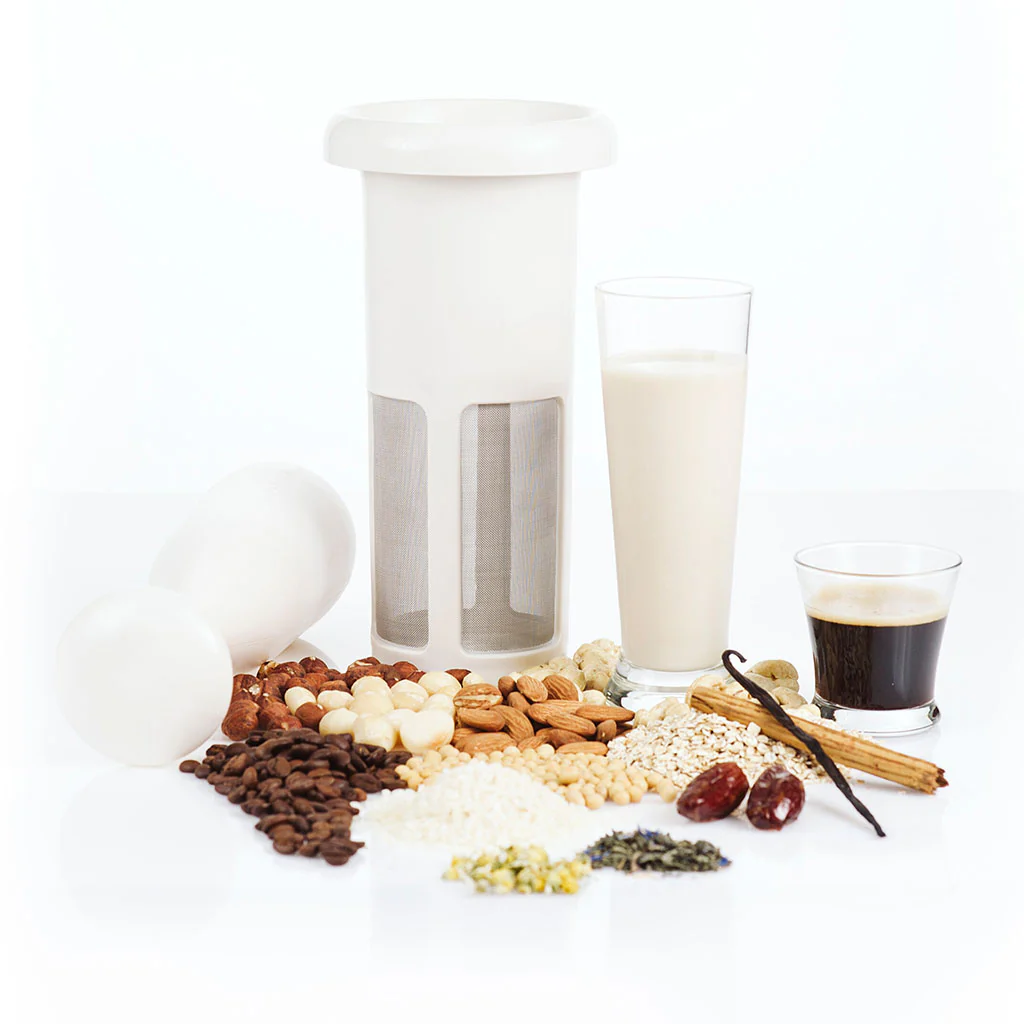 La Vegan Milker® está compuesta por un recipiente con tapa, un vaso filtrador, con filtro de malla fina de acero inoxidable alemán, y un mortero. Con ella podrás hacer todo tipo de bebidas vegetales, tanto de semillas, frutos secos o cereales, como horchata, zumos frutas, verduras y hortalizas, yogures y quesos, ¡e incluso café!