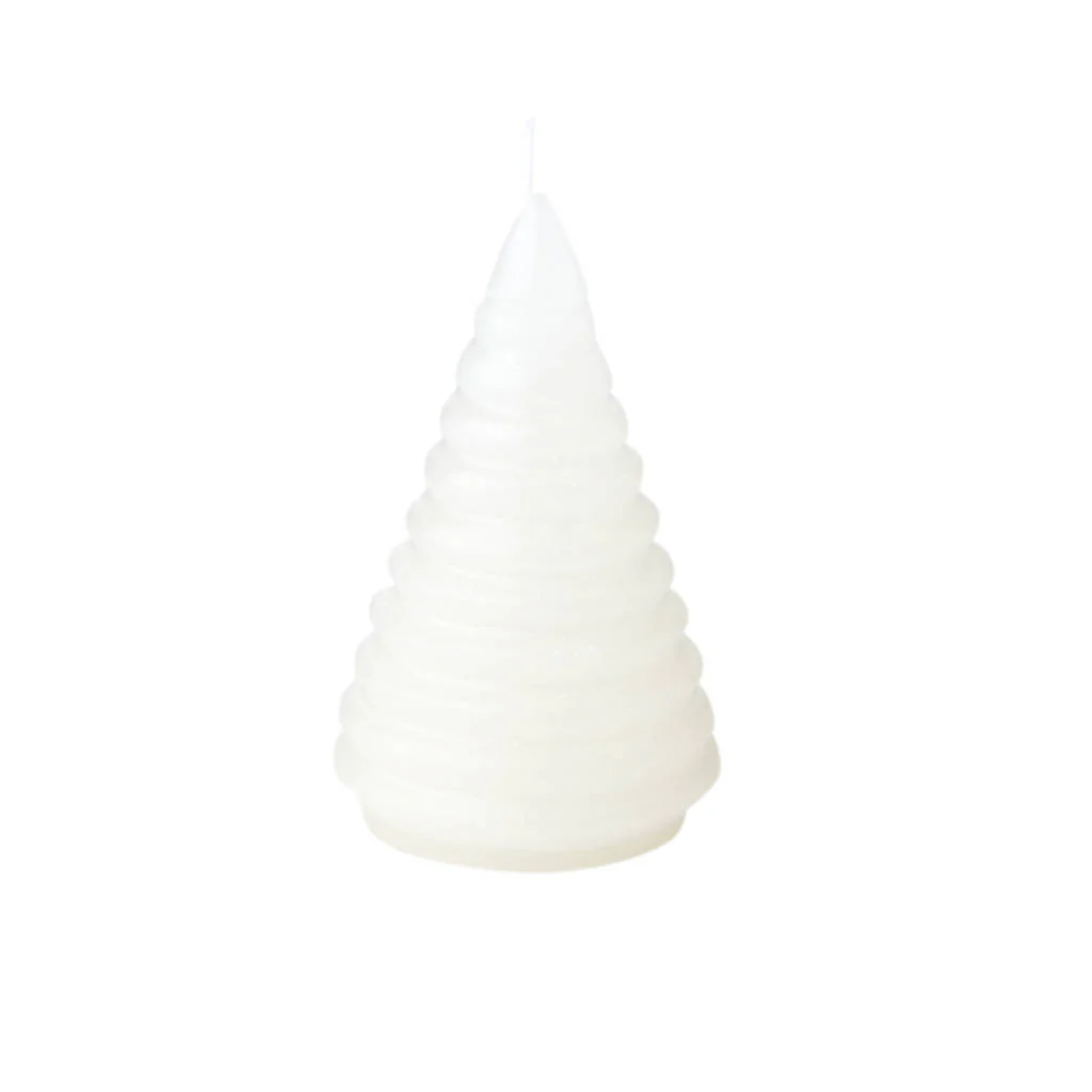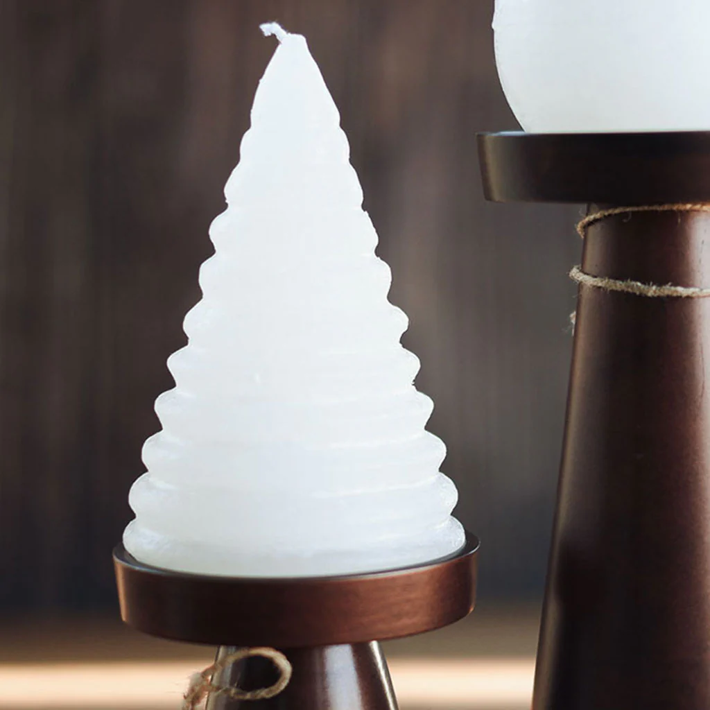 Una vela blanca en forma de árbol, nada mejor para representar a un árbol nevado y traer la calidez del hogar en esas épocas tan entrañables.