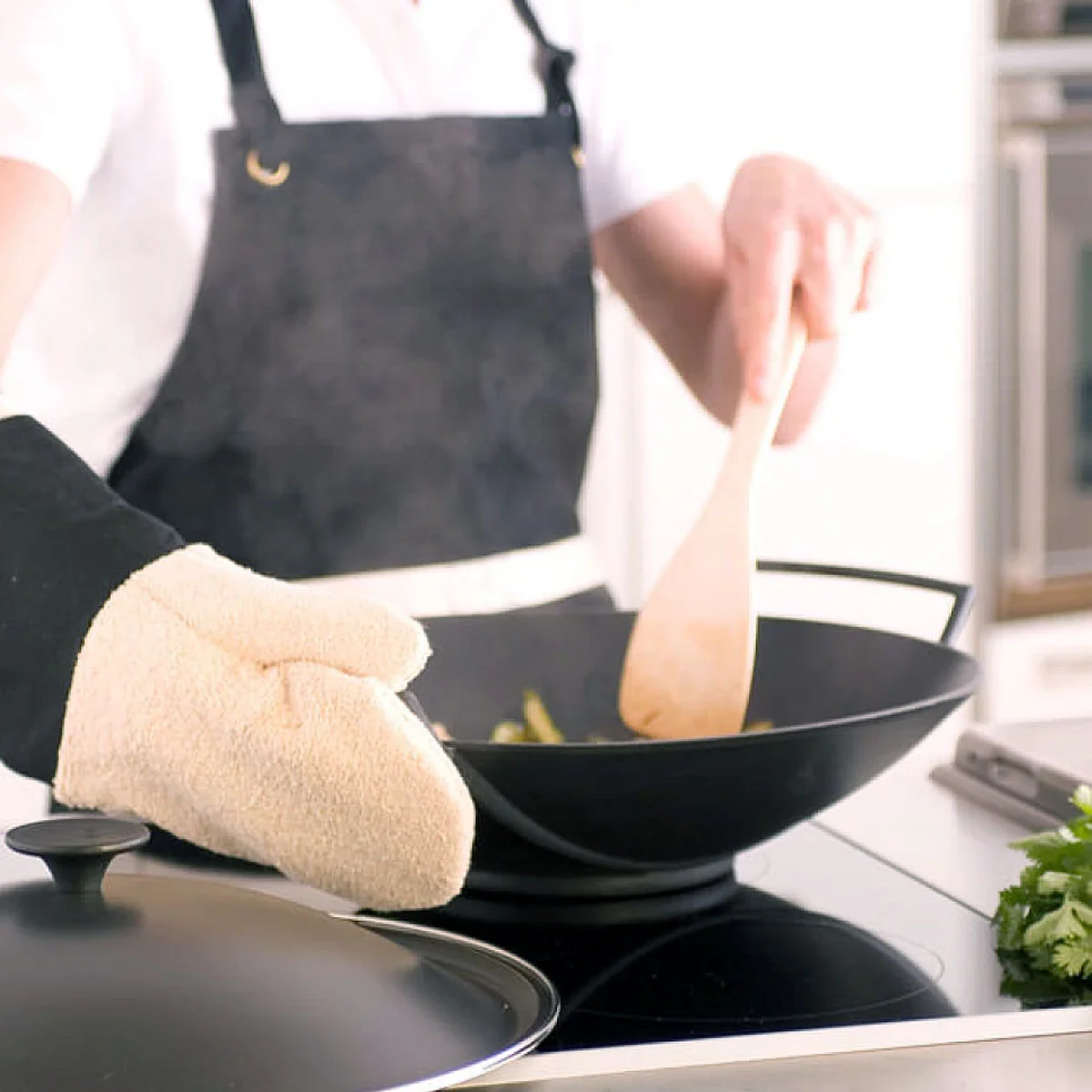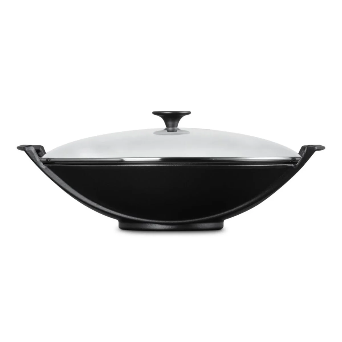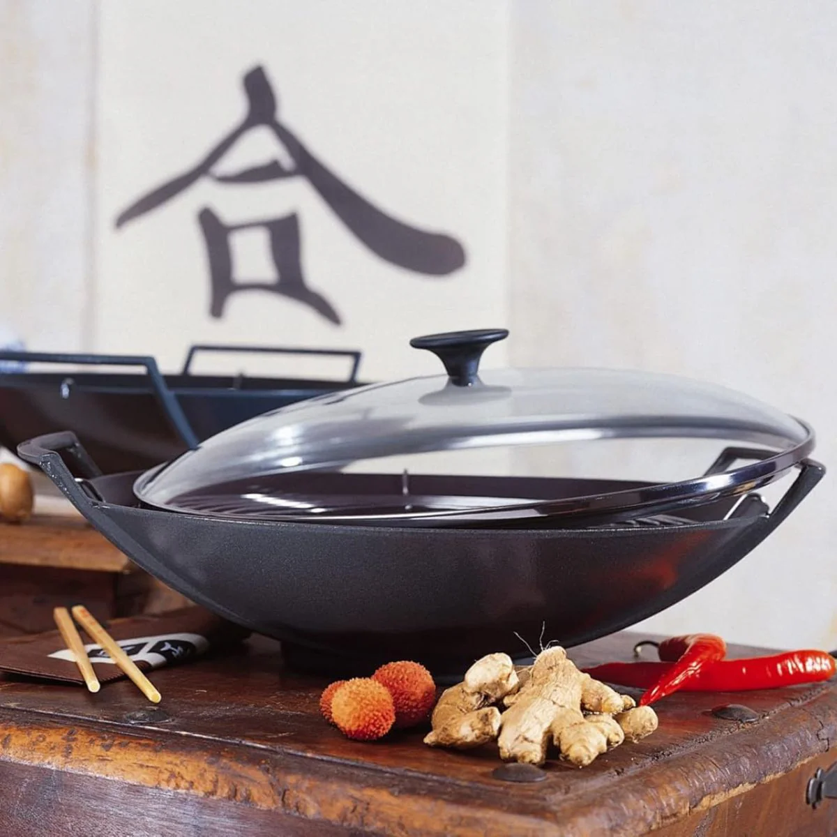 El Wok (kuo en el idioma mandarín) que significa literalmente «recipiente en el que se cuece», es un utensilio originario de la China. El Wok de Le Creuuset se une a la colección de menaje de cocina de hierro colado. El pomo fenólico de la tapa de cristal, luce en perfecta harmonía con el esmaltado negro mate.
