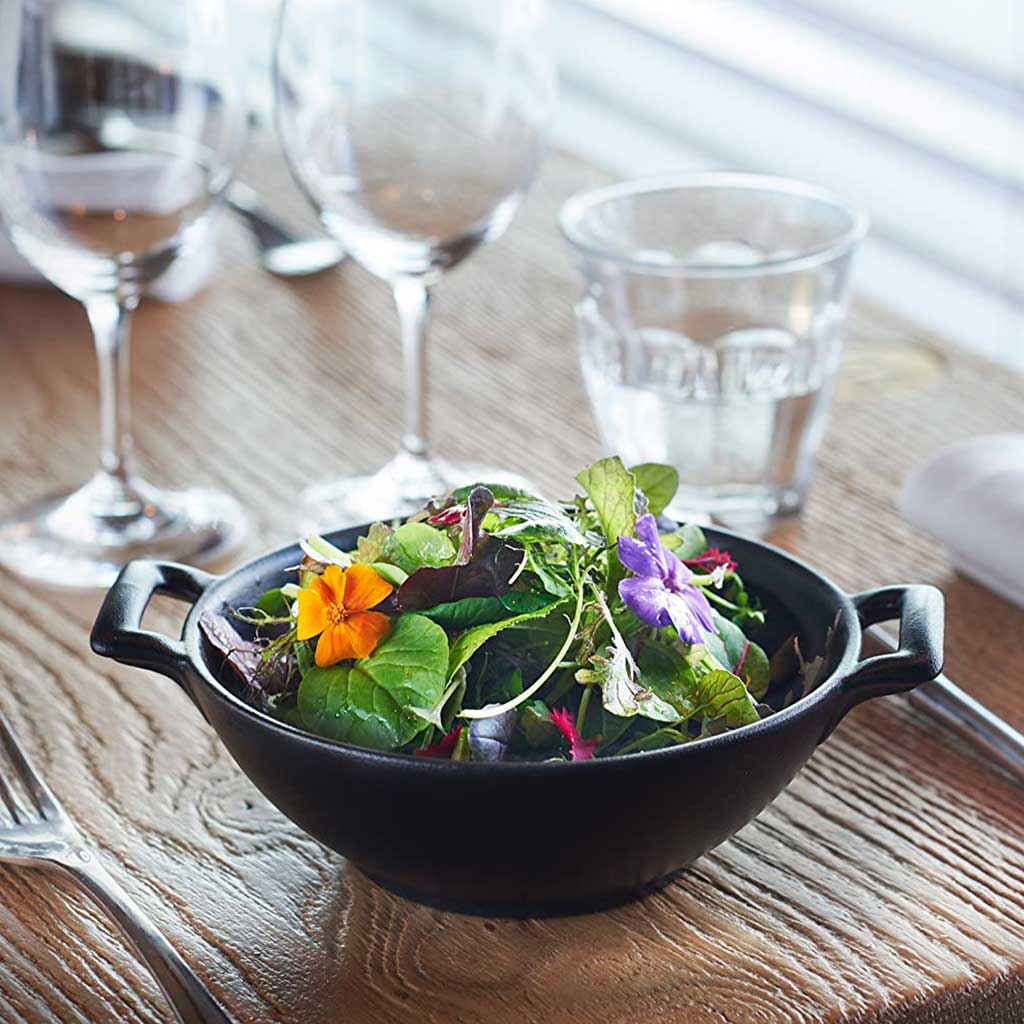 Esta encantadora pieza es ideal tanto para servir unos aperitivos o presentar las salsas, como para emplatar los entrantes, unas ensaladas u hornear tus guisos más sabrosos en formato individual y llevarlos tal cual a la mesa. ¿Te imaginas cómo lucirán unas verduras salteadas con gambas, unas almejas a la marinera, unas ricas croquetas o una sopa de chocolate blanco con frambuesas presentadas en estos mini woks?